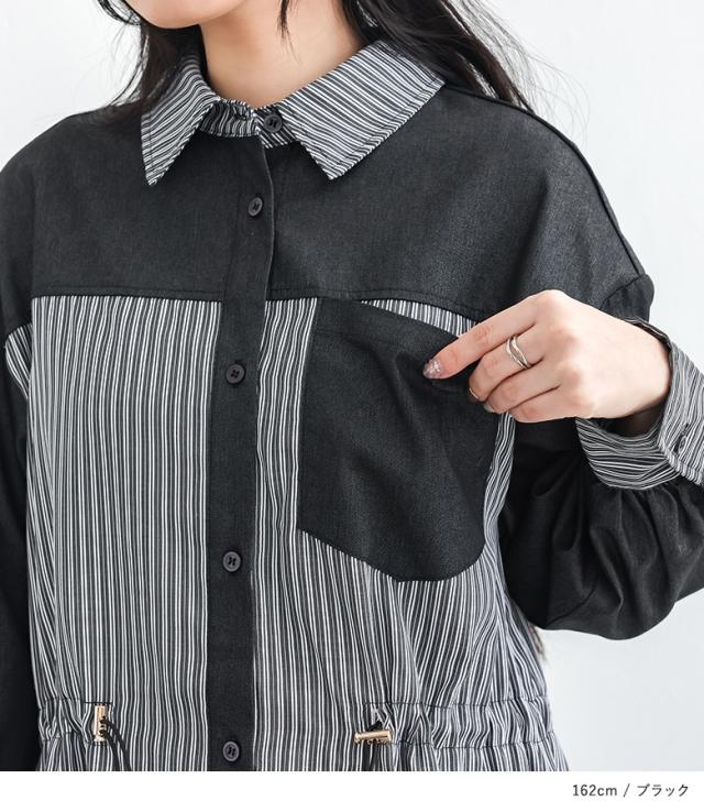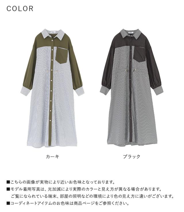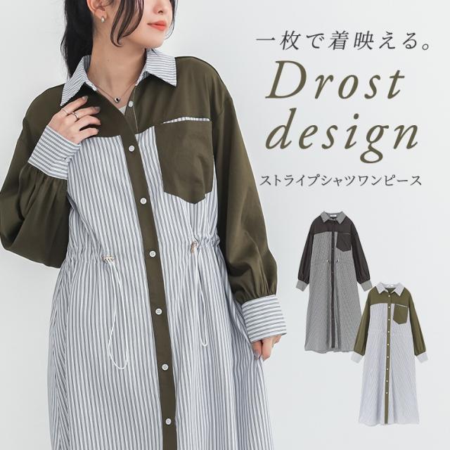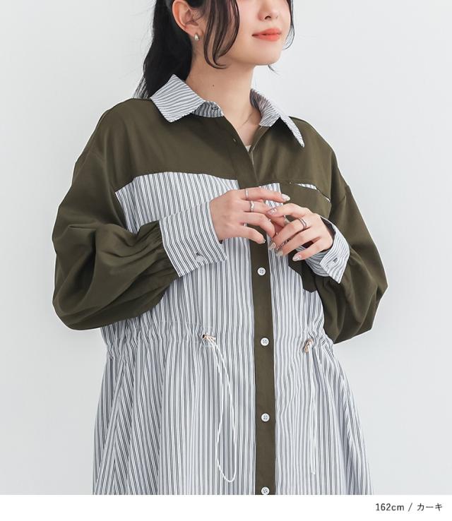 シャツワンピース レディース 長袖ワンピース ロングシャツ ストライプ柄 異素材 羽織り 春 秋 冬 オシャレウォーカー 【TP】 トップス シャツ ボタンシャツ 前開きシャツ 襟付きシャツ ワンピース ロングワンピース マキシワンピース シャツワンピ 襟付き 長袖 ロング丈 マキシ丈 フルレングス 10分丈 ドロップショルダー Aライン 切り替え 配色 無地 異素材MIX ポケット ドロスト カジュアル シンプル ナチュラル モード キレカジ 可愛い系 大人女子 大人可愛い お洒落可愛い 大人カジュアル 上品 きれいめ ベーシック ニュアンス ラフ Sサイズ Mサイズ Lサイズ LLサイズ 3Lサイズ XLサイズ フリーサイズ ぽっちゃり 体型カバー 大きいサイズ プラスサイズ 10代 20代 30代 40代 50代 60代 低身長 高身長 女子会 オフィス 通勤 通学 お買い物 お出掛け 旅行 おしゃれ お洒落 トレンド 流行 osharewalker 緑色 カーキ ブラック 黒[ID]11dp053[ストライプドロストシャツワンピース]