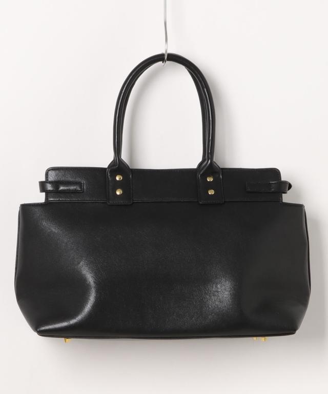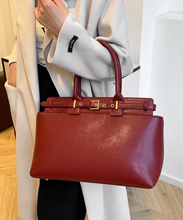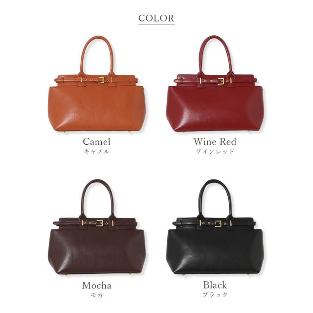きめ細やかなシュリンクPUレザーを使用し、トップにベルトモチーフを取り入れた上品なハンドバッグ。
