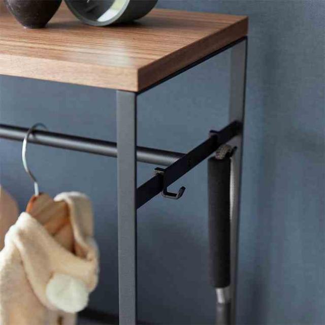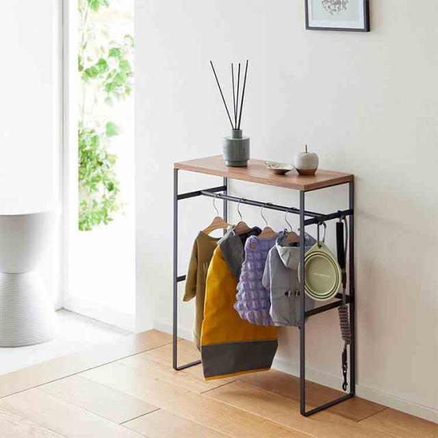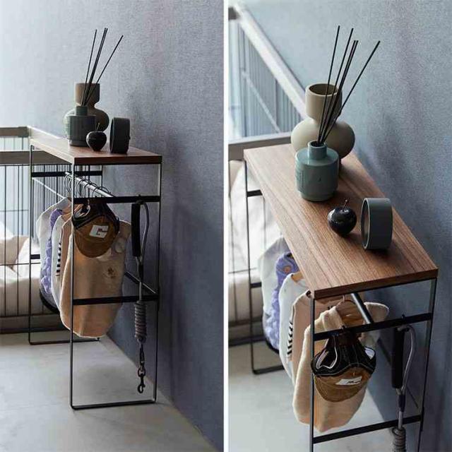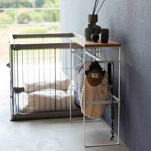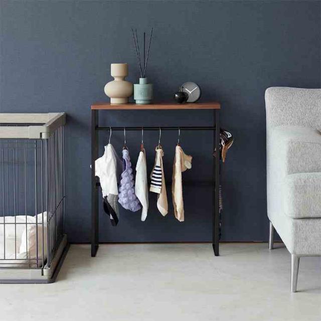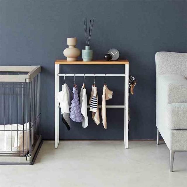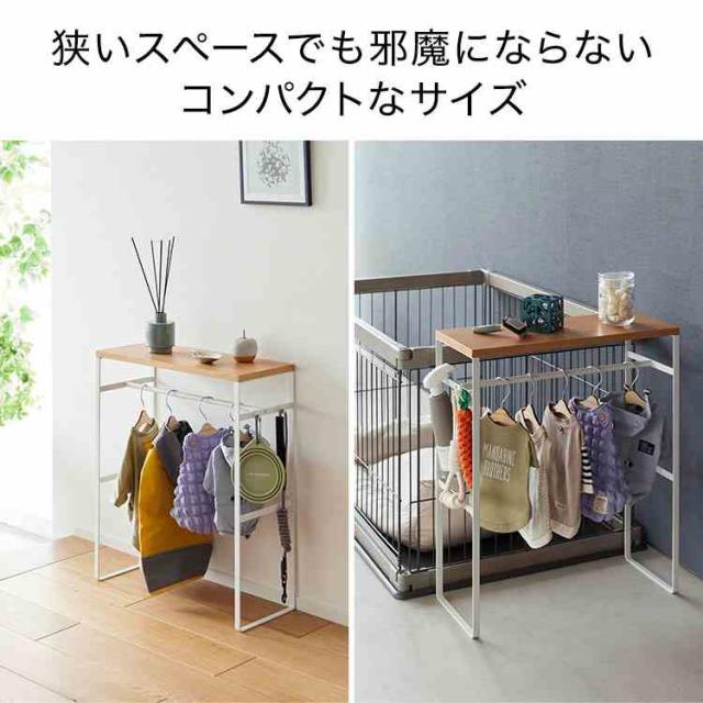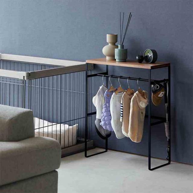 ペットの洋服や小物をまとめて収納。インテリアに馴染むペットコートハンガーラック。奥行スリムなので玄関に置いても邪魔になりません。ペット用ハンガーが出し入れしやすいサイズ。付属のフックにお散歩道具を掛けられます。お出かけ時にサッと取り出せて便利。コンソールテーブルとしても使用できます。天板はおやつストックなど、小物置きとして。ペットケージの奥行にも納まり、並べて置いてスッキリ整頓。
