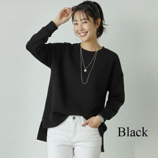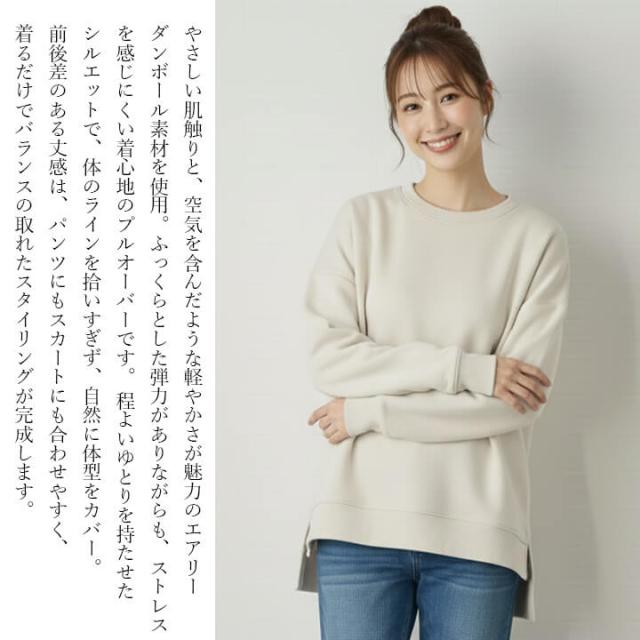 エアリーダンボールプルオーバー ストレスフリー ハイアンドロー トップス カジュアル レディース プルオーバー ミドル丈 ハイロー丈 春 秋 冬 女性 可愛い 着回し ゆったり 体型カバー あったかい 柔らか 快適 デイリー コーデ 大人 上品 シンプル ラフ