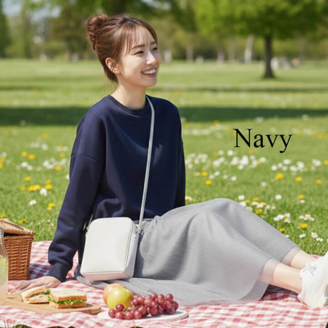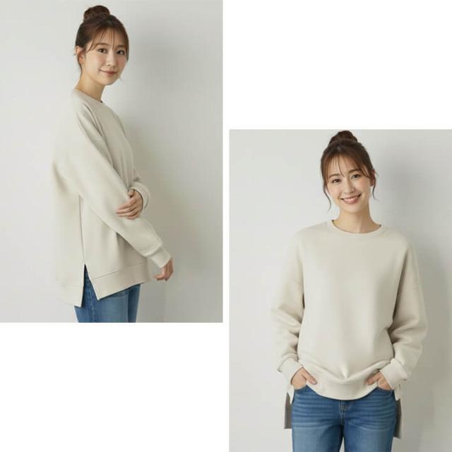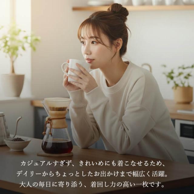 程よいゆとりを持たせたシルエットで、体のラインを拾いすぎず、自然に体型をカバー。