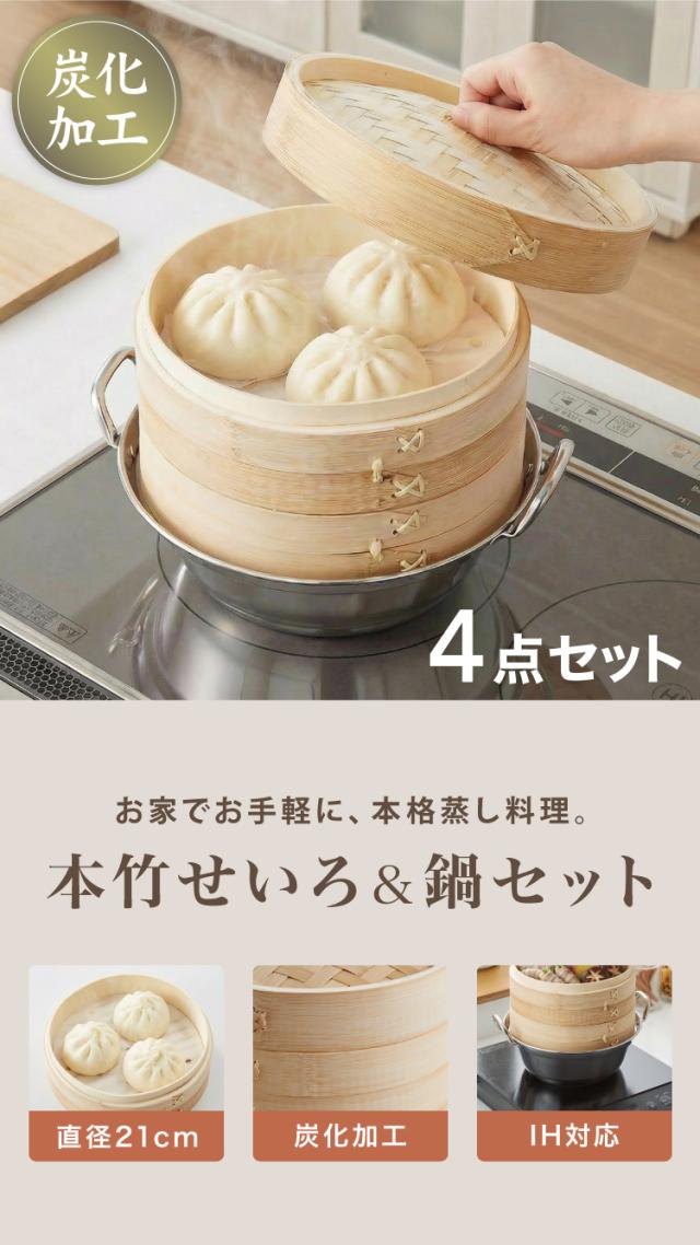 21cm規格の炭化加工竹せいろ 本体2点+フタ1点+鍋1点 計4点セットになります。