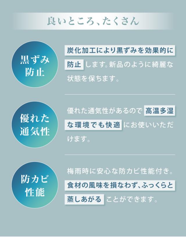 梅雨時でも安心の防カビ性能で、食材の風味などを損なわずにふっくらと蒸しあげます。