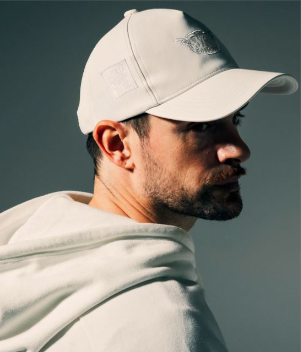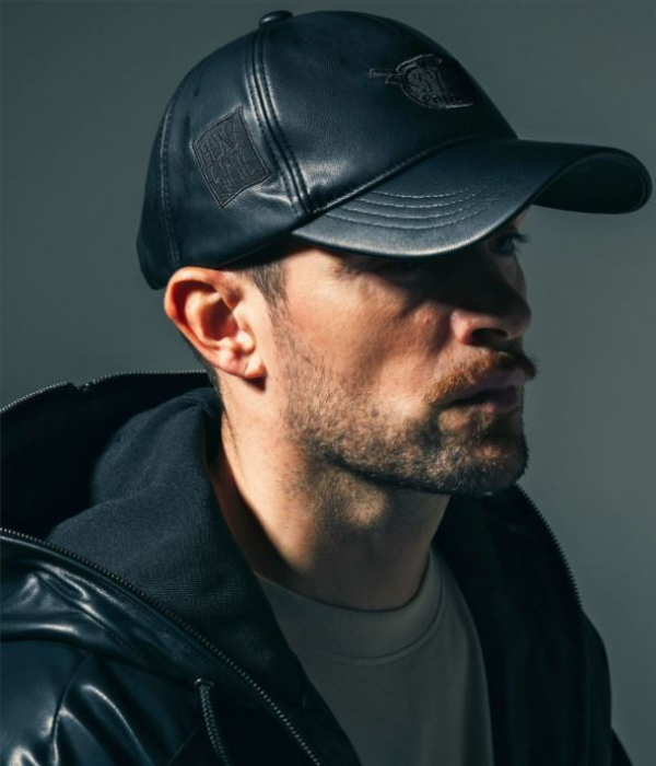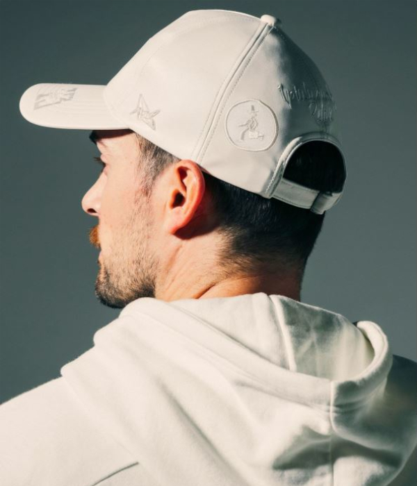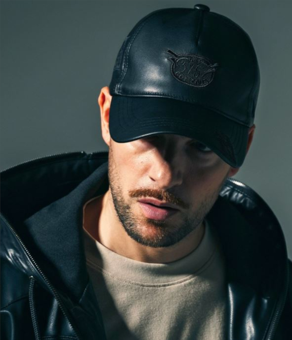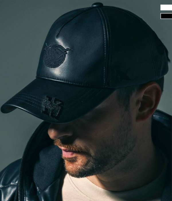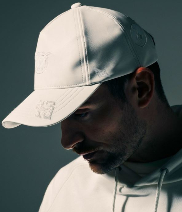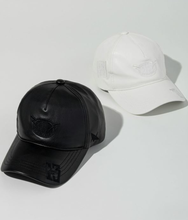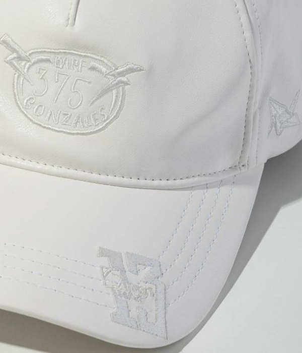 マークゴンザレスのアートワークをアップリケで散りばめたフェイクレザーキャップ。