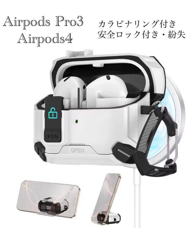 3 Airpods Pro3 ケース Airpods4 ケース 磁気安全ロック カラビナ イヤホンケース 自動ポップアップ機能 全面保護 耐衝撃 落下防止 保護カバー ホワイト