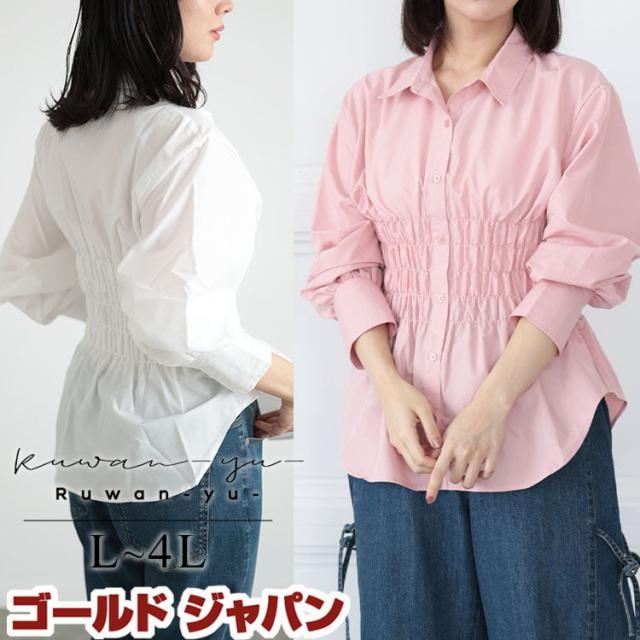 冬新作 大きいサイズ レディース トップス シャツ ブロードシャーリングシャツ レギュラーカラー 長袖 シャーリング ギャザー ハイウエスト ラウンド裾 カジュアル スリム 無地 ゆったり 春服 秋服 L LL 2L 3L 4L オフホワイト ピンク ゴールドジャパン ルワンユー ruwanyu