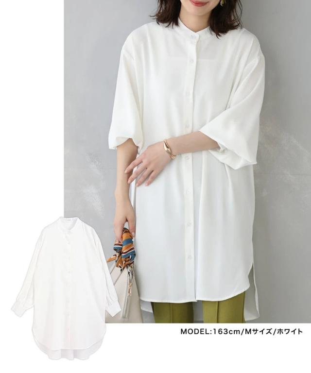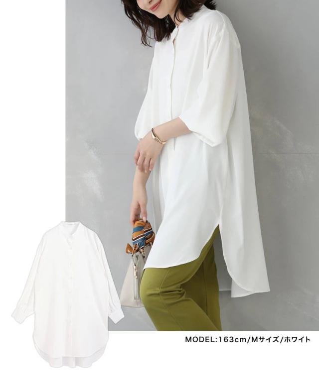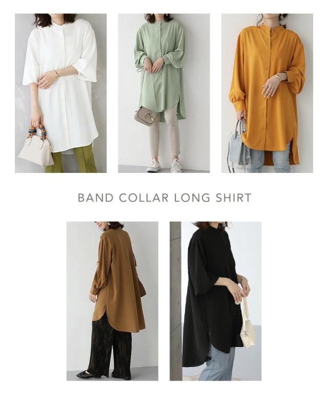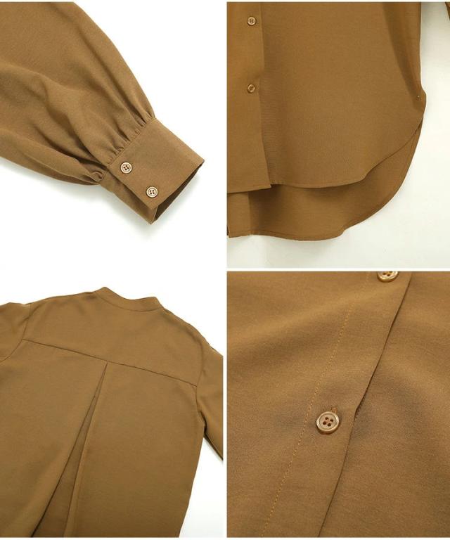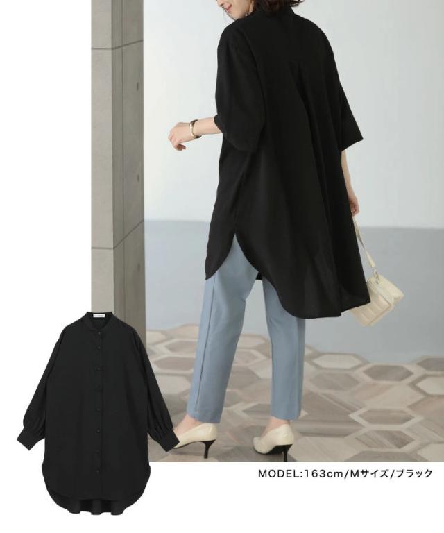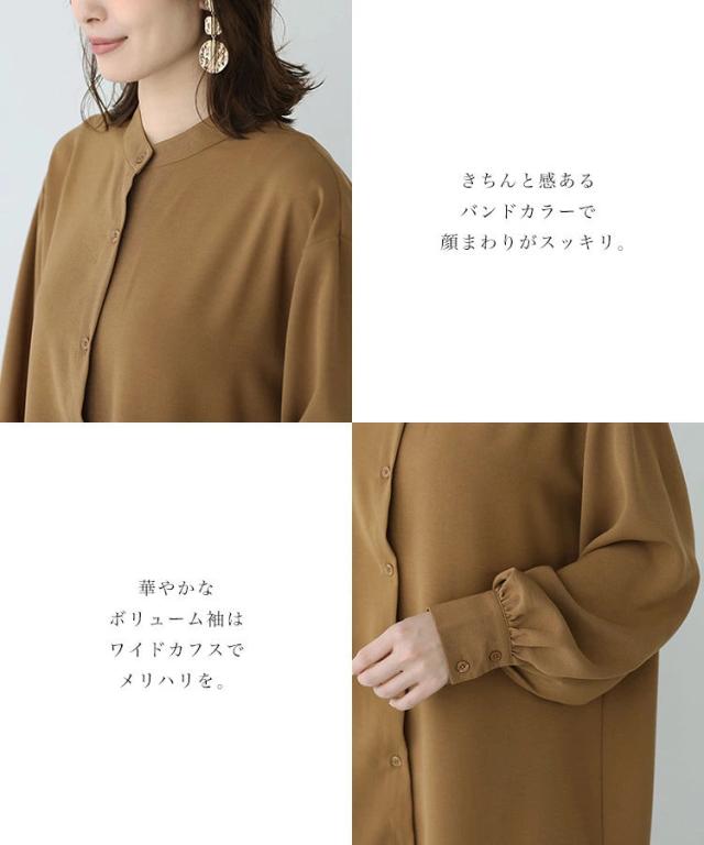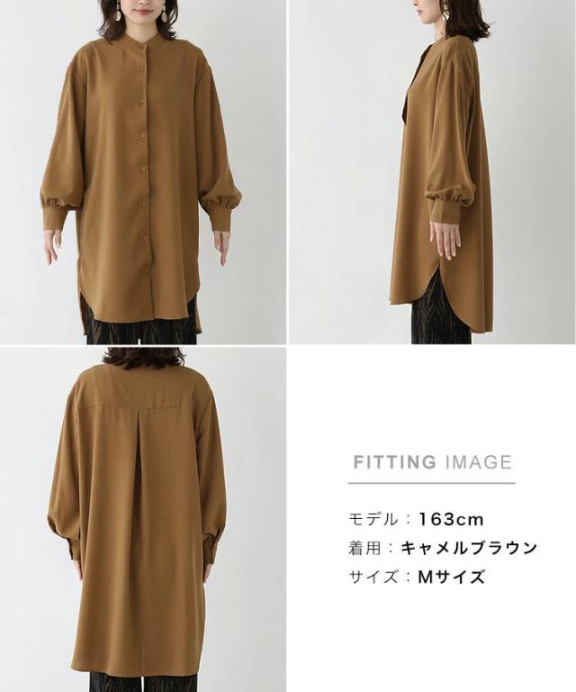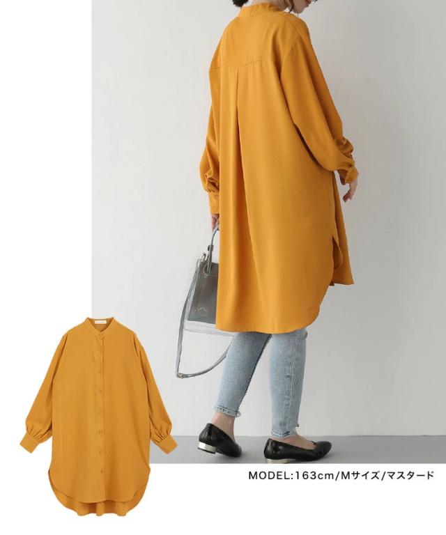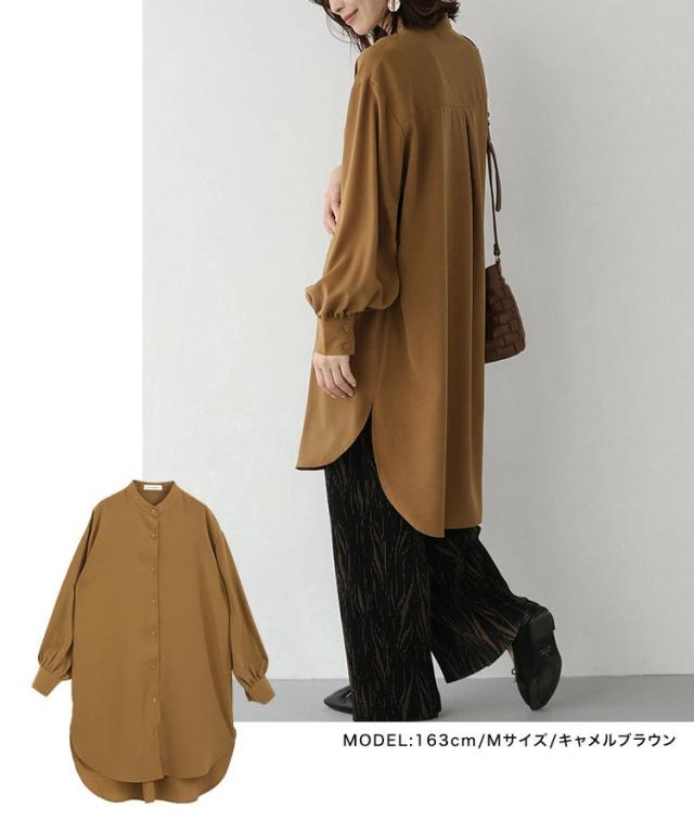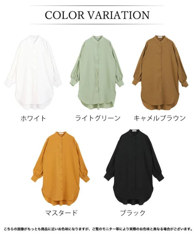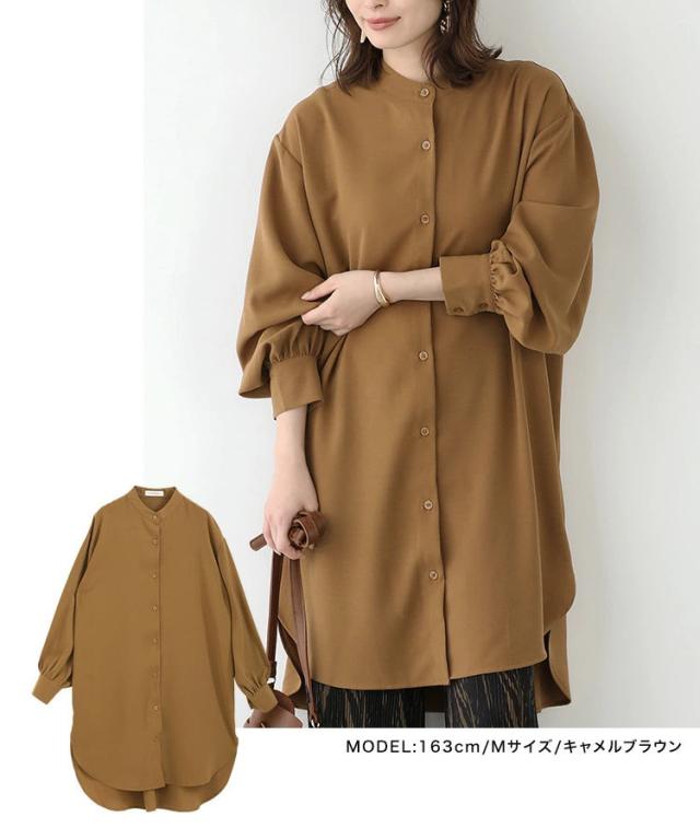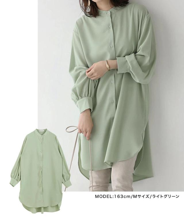 バンドカラー ふわり袖 シャツワンピース チュニック丈 チュニックブラウス 長袖 シャツワンピ シャツ ブラウス ロングシャツ ワンピース ワンピ スタンドカラー ボリューム袖 春 秋