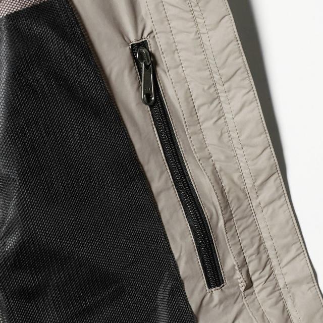 微細なコーティング技術による耐久はっ水加工により、多少の雨に対応し、ベンチレーション兼用のファスナーポケットにより、衣服内のムレを素早く排出。
