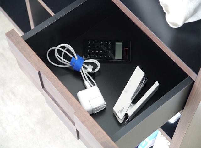 文具や印鑑、リビング周りの小物を整理できる引出し。見えるところに出しておくのは嫌だけど、すぐに手に取りたい細かいものの収納に便利です。