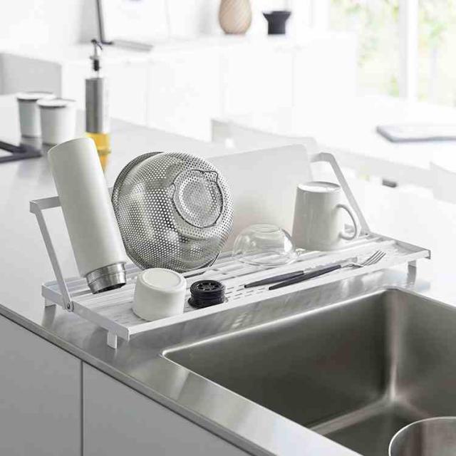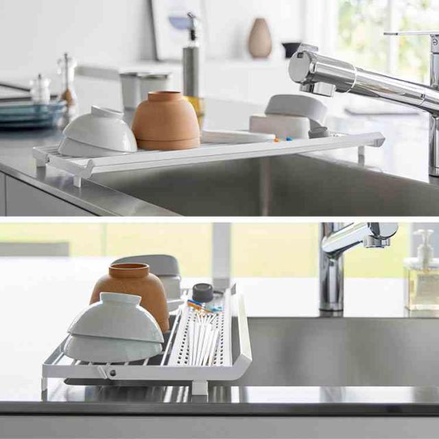 可動式スタンドバー付きの水切りラックです。バーを立てることで、ジャグボトルやまな板、お皿などを立てて乾かせます。シリコーン製のトレーには、お箸や小物の水切りに最適。シンクに渡して使えるスリム設計で、取り外し可能なシリコーントレーはお手入れも簡単です。