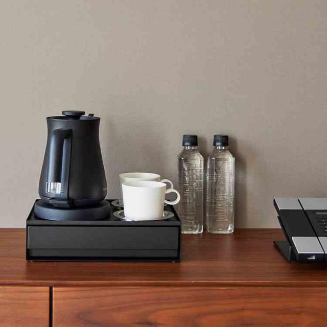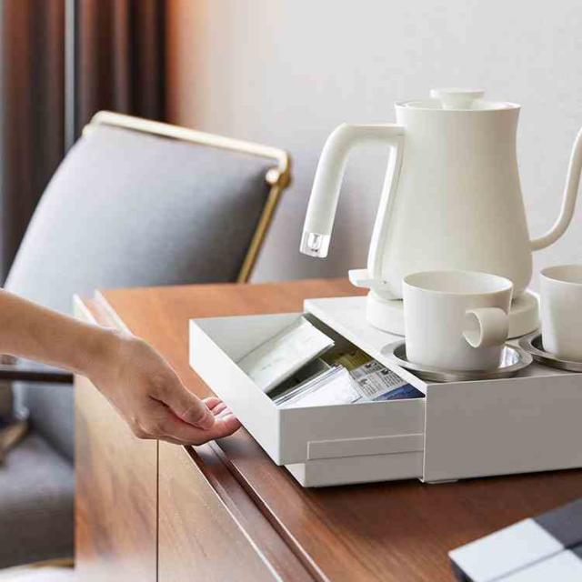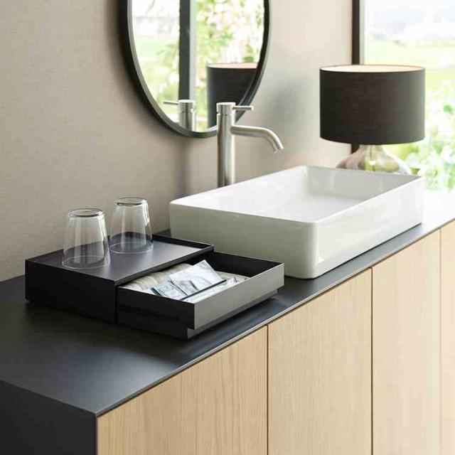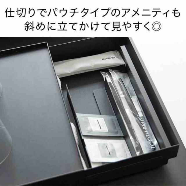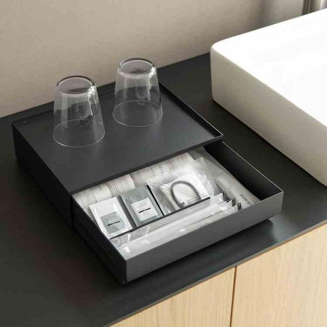 洗面まわりのアメニティをすっきり隠せる、トレー付きの引き出し収納です。カップやドリンクまわりの小物をまとめて置けるので、整ったドリンクスペースを作れます。付属の可動式マグネット仕切り(2個)を使えば、パウチタイプのシャンプー類も斜めに立てかけて見やすく収納可能。引き出しの中も整理しやすく、使い勝手の良いデザインです。ホテルやオフィスでの使用はもちろん、シンプルなのでご自宅での使用もおすすめです◎