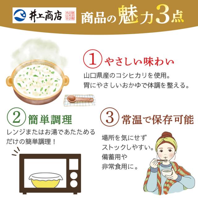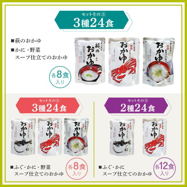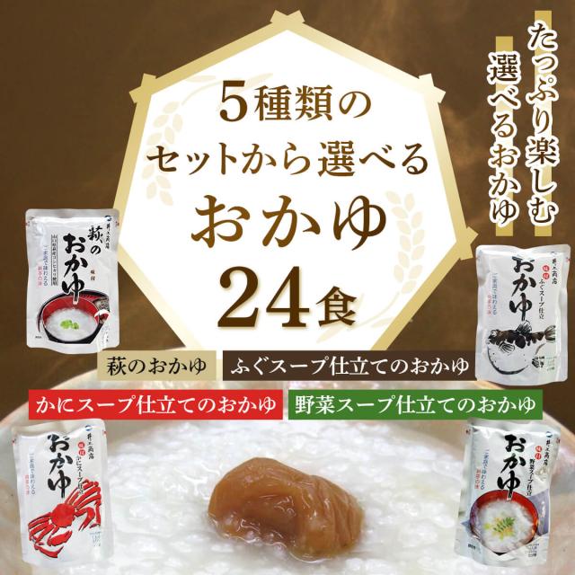 井上商店 5種の セット の中 から 選べる おかゆ 24食 詰め合わせ山口県産の うるち米 コシヒカリ 使用 の 萩のおかゆ/かに/ふぐ/野菜 の スープ仕立て お米 の食感と具材の旨味が味わえる。レンジ 湯煎 で 温めるだけ の 簡単料理 常温 で そのまま でもお召し上がりいただけます。低カロリー で 朝食 夜食 に おすすめ 。