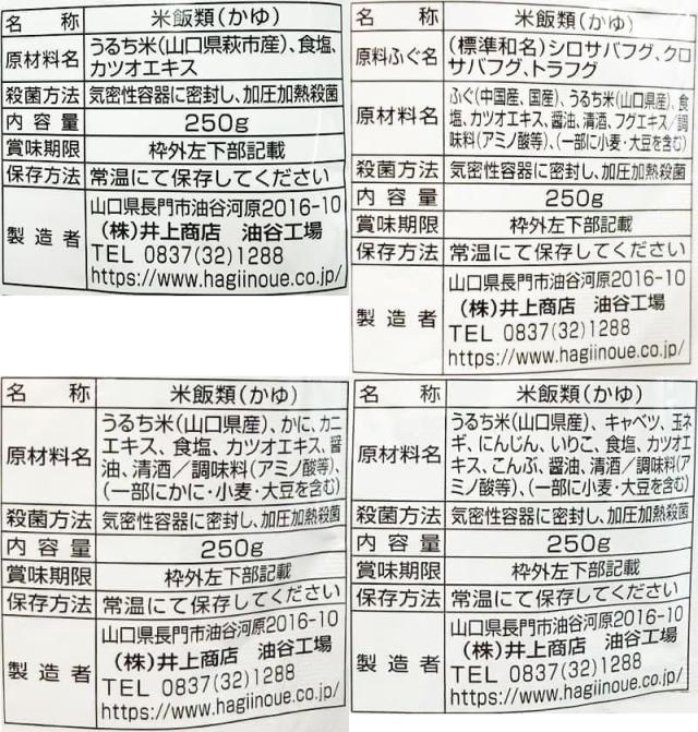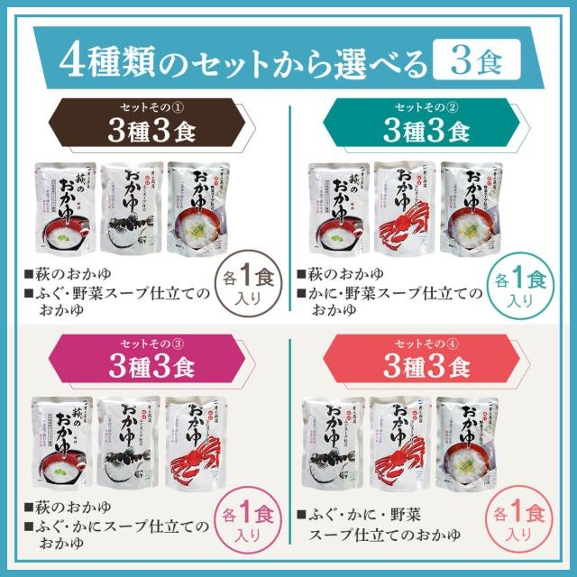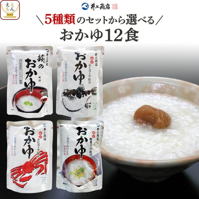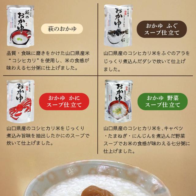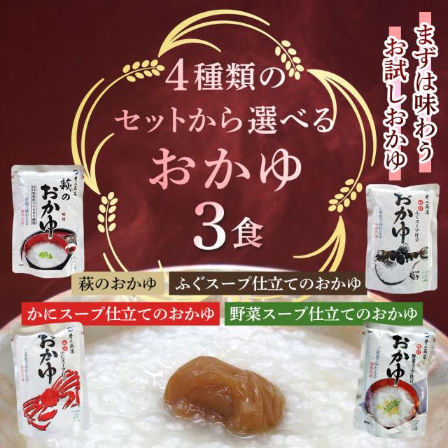 井上商店 4種の セット の中 から 選べる おかゆ 3食 お試し 詰め合わせ 山口県産の うるち米 コシヒカリ 使用 の 萩のおかゆ/かに/ふぐ/野菜 の スープ仕立て お米 の食感と具材の旨味が味わえる。レンジ 湯煎 で 温めるだけ の 簡単料理 常温 で そのまま でもお召し上がりいただけます。低カロリー で 朝食 夜食 に おすすめ 。