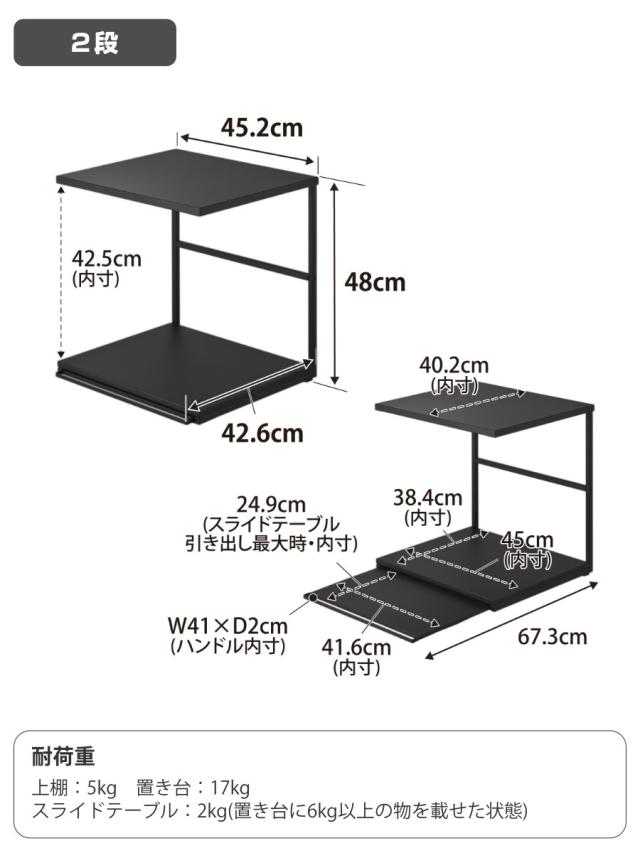 | 耐荷重 | 上棚:5kg 置き台:17kg スライドテーブル:2kg(置き台に6kg以上の物を載せた状態)(静止荷重) |