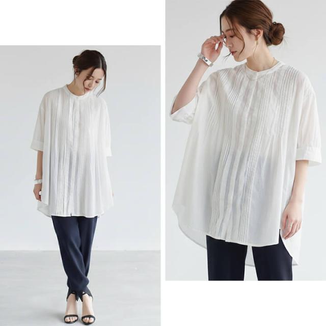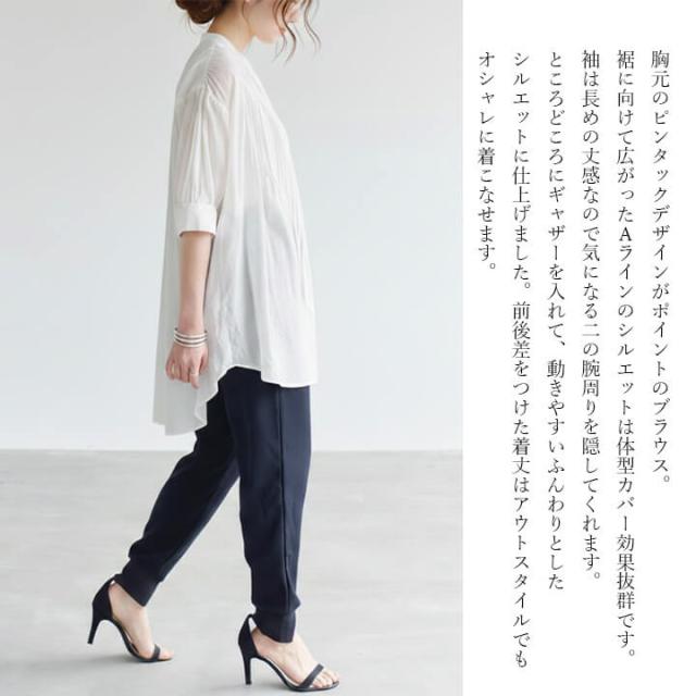 胸元のピンタックデザインがポイントのブラウス。