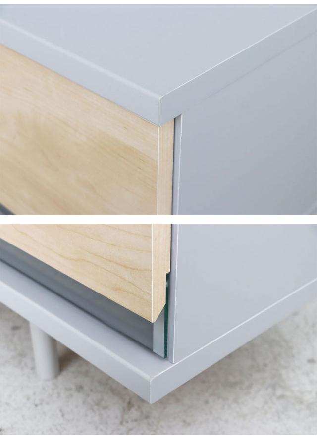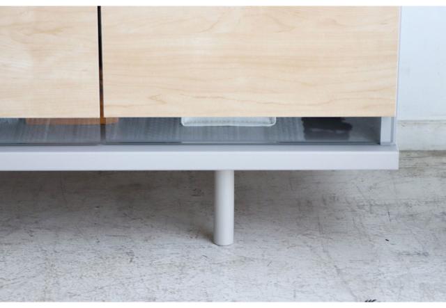 グレージュの本体にナチュラルウッドの扉が4枚配され、ガラスのアクセントが軽やかな印象を与えます。