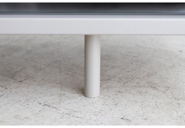 床から浮かせたデザインは空間に広がりを感じさせ、ミニマルながらも存在感のあるリビングを演出します。