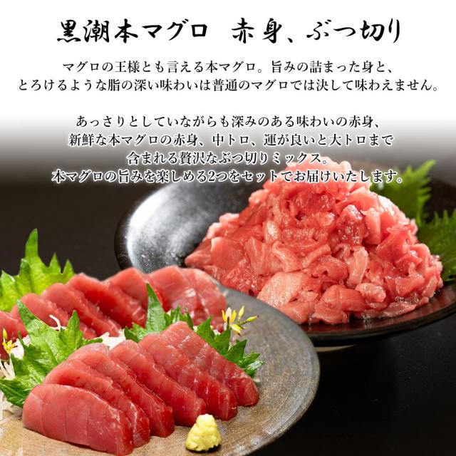 あっさりとしていながらも深みのある味わいの赤身と、新鮮な本マグロの赤身、中トロ、運が良いと大トロまで含まれる贅沢なぶつ切りミックス。 本マグロの旨みを楽しめる2つをセットでお届けいたします。