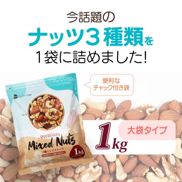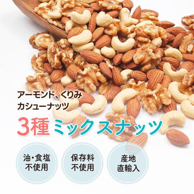 3種 ミックスナッツ 1kg アーモンド くるみ カシューナッツ 素焼き 食塩不使用 添加物不使用 植物油不使用 チャック付き袋 おやつ おつまみ ギフト 防災食品 非常食