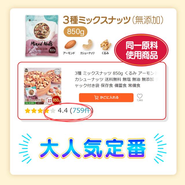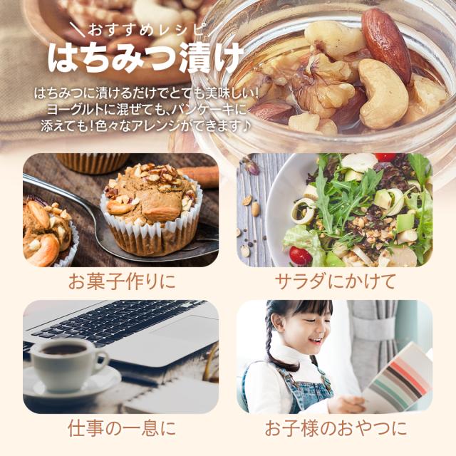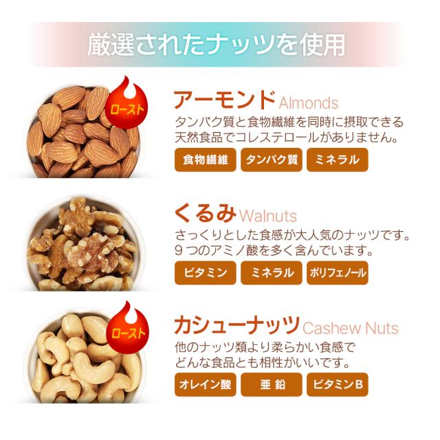 | 原材料名 | アーモンド(アメリカ産)、くるみ、カシューナッツ (アーモンド、カシューナッツは焙煎。くるみは生。) |