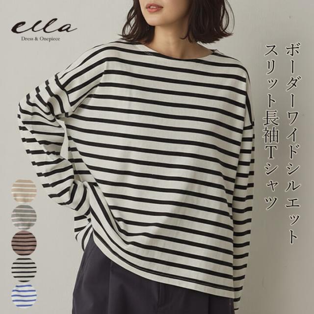 シンプルながらも存在感を放つ、ボーダーワイドシルエットスリット長袖Tシャツ。