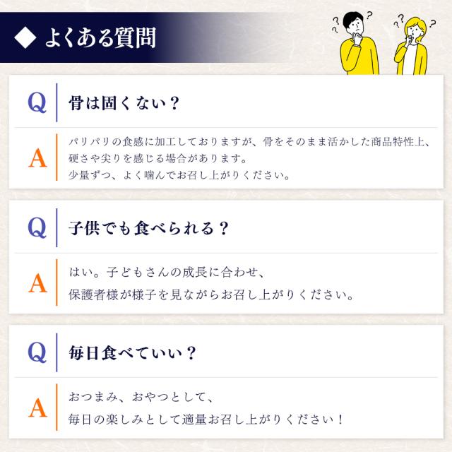 ※魚の骨をそのまま加工しているため、尖った部分がございます。口腔内を傷つけないよう少量ずつよく噛んでお召し上がり下さい。