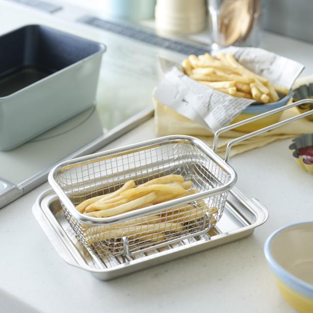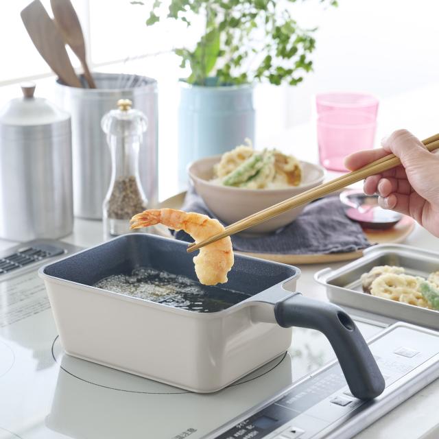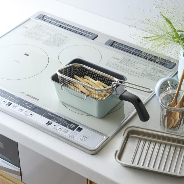 少ない油でサクッと揚がるToffyの角型揚げ鍋は、幅広のスクエア形状を採用し、トンカツもエビフライも折らずにゆったり調理できます。深型設計でコンロまわりの油跳ねをしっかりガードし、下ごしらえから油切りまでこれひとつで完結。付属のバスケットを使えばポテトなども一度に引き上げられ、揚げ物のハードルをぐっと下げてくれます。内面はふっ素樹脂加工でお手入れも簡単。コンパクトながらコンロの上で場所を取らず、毎日の揚げ物をぐっと身近で手軽なものに変えてくれる万能な一台です。