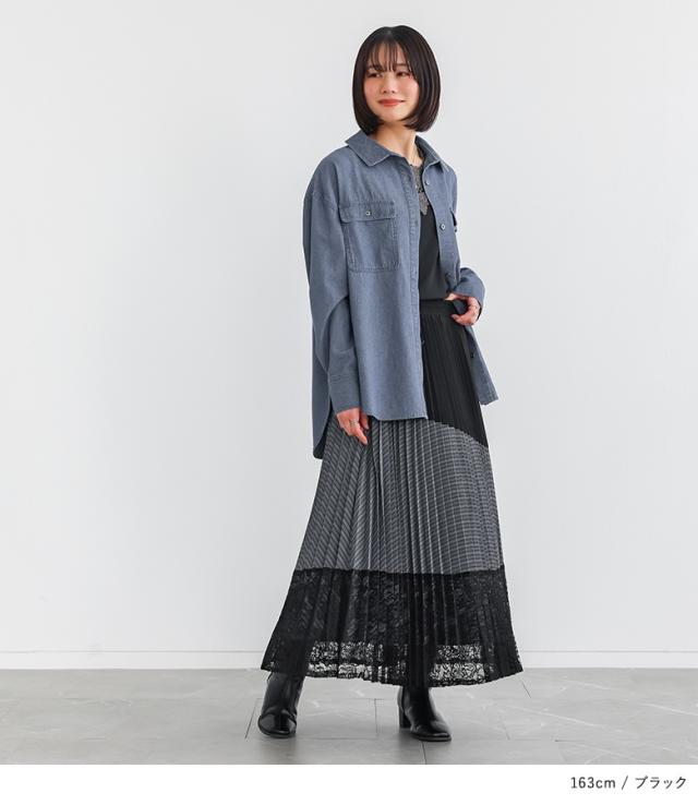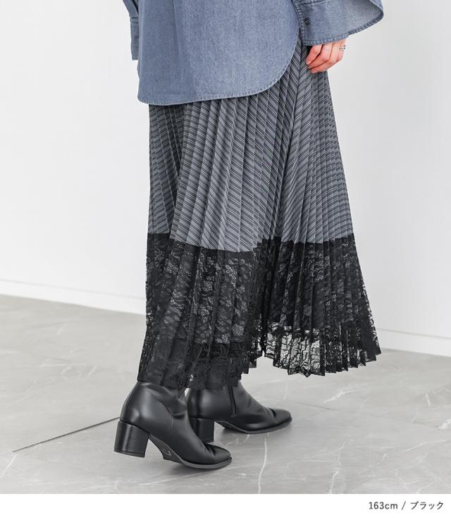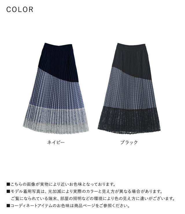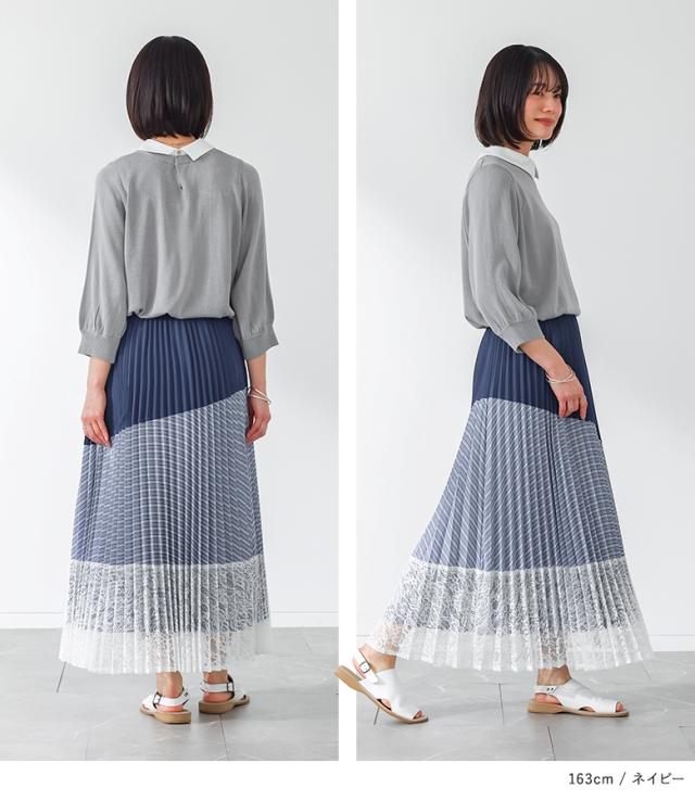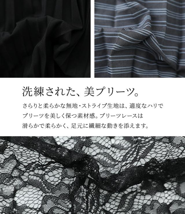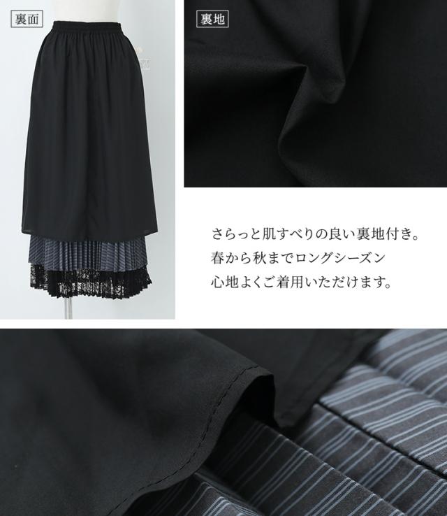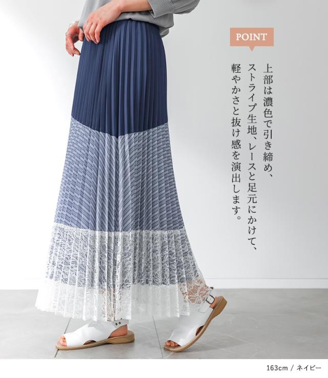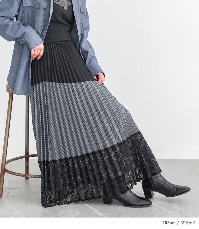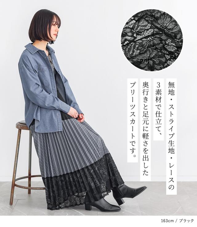<春新作>『異素材プリーツ切替スカート』【メール便不可】【20】[スカート ロング丈 レディース ボトムス プリーツスカート レース ストライプ柄 無地 ウエストゴム 裏地付き 異素材 ゆったり 春 夏 秋]