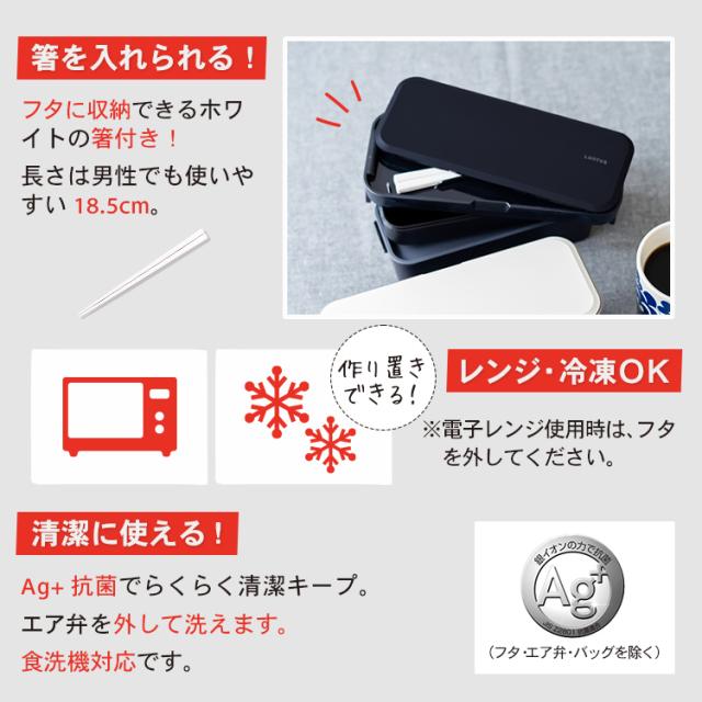 材質 : 箸フタ=ABS樹脂 箸=AS樹脂 上容器フタ=AS樹脂/ABS樹脂/熱可塑性エラストマー 上容器・下容器・下容器フタ・仕切・止め具・弁本体=ポリプロピレン エア弁=シリコーンゴム