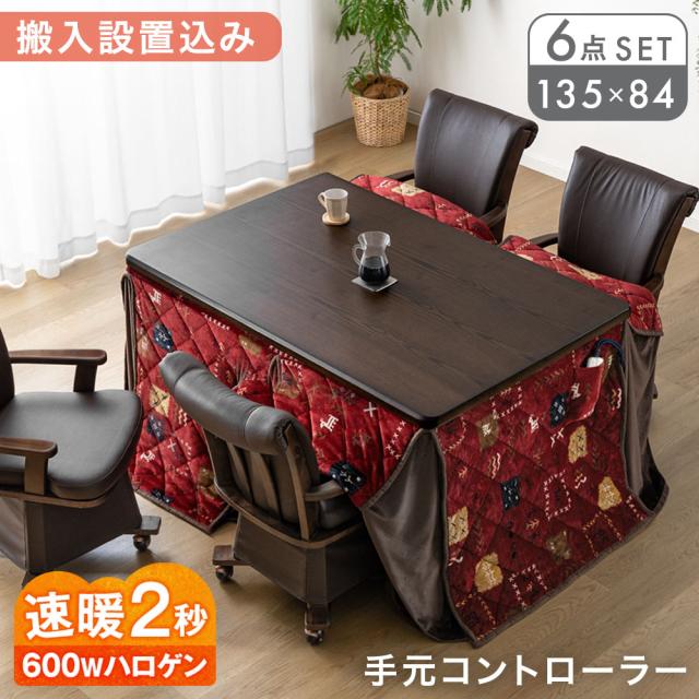 速暖2秒 600Wハロゲン ダイニングこたつ 6点 セット 幅135cm 高さ調節 手元コントローラー 長方形 回転椅子 肘付き 椅子 ハイタイプこたつ 高脚こたつ 高足こたつ ダイニング こたつ 布団セット こたつテーブル 4人用【超大型】