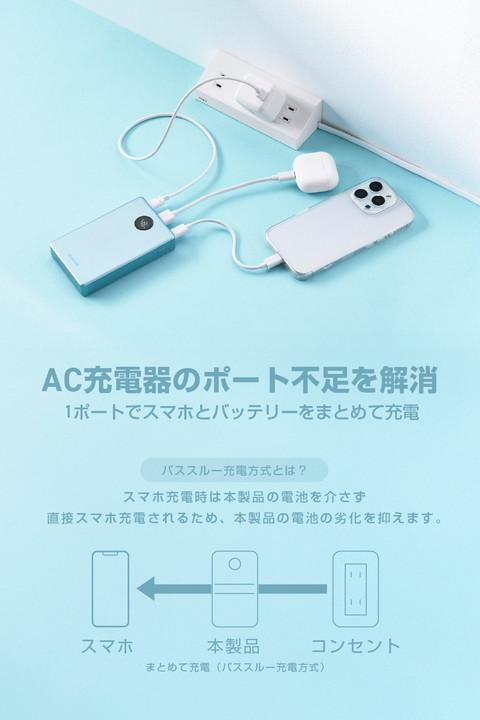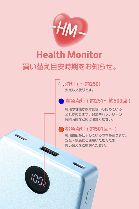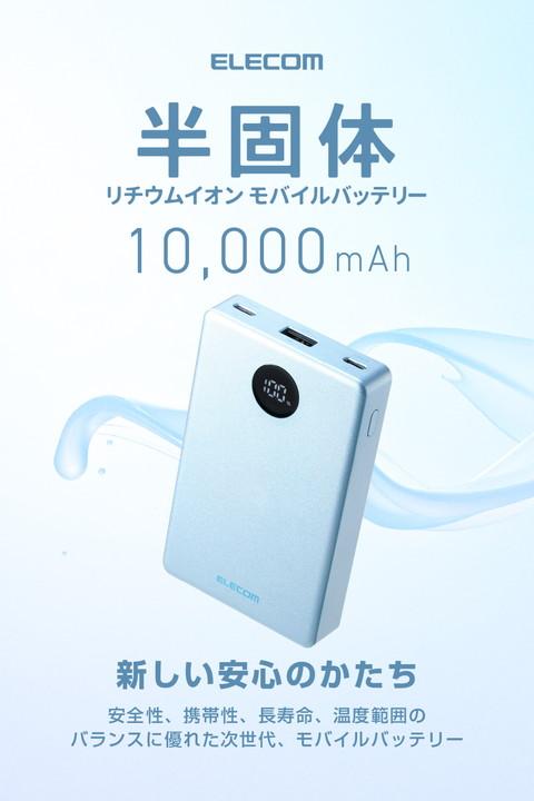 半固体リチウムイオン電池を採用した次世代モバイルバッテリーです。猛暑や極寒の環境でも使用でき、発火しにくい高い安全性と約2000サイクルの長寿命、優れた携帯性を実現。どこへでも持ち運べて、安心して使えます。さらに、バッテリー残量はLEDパネルに1%刻みで表示されるので、必要なタイミングで効率よく充電できます。![]() ■半固体リチウムイオン電池を採用し、高い安全性・長寿命・幅広い使用温度範囲・高い携帯性を備えた、10000mAhのモバイルバッテリーです。 ■半固体電池は、電解液のゲル化により液漏れを防ぎ、可燃性有機電解液の使用量を低減することで、内部短絡時の可燃性ガスの発生・放出を抑制し、安全性を高めます。 ■従来のリチウムイオン電池(※)を使うモバイルバッテリーのサイクル寿命は約500回。半固体リチウムイオン電池は、電解液をゲル状にすることで化学的安定性が高まり、約2000回と従来の約4倍の電池寿命を実現しています。 ※液体電解質のリチウムイオン電池 ■従来の一般的なモバイルバッテリーの放電温度範囲は0℃〜40℃ですが、本製品は-15℃〜45℃まで対応。 幅広い温度環境で使用できるため、猛暑や極寒の土地でも安心して使えます。 ■※-15℃〜45℃は放電時の環境温度です。接続機器や本製品の条件により、出力が低下・停止する場合があります。 ■※本製品は防水・防塵仕様ではありません。 ■安全性が高い設計ながら、携帯性を犠牲にしないサイズと重量を実現しています。 ■USB Type-C(TM)ポート×2、USB-A×1を搭載し、最大で3台の機器を同時に充電できます。 ■※3ポートの同時出力時は、合計最大20Wを分配して充電を行います。 ■USB Type-Cポートの単独使用でUSB Power Deliveryの最大35W(PPS最大33W)出力が可能。スマートフォンやタブレットはもちろん、Macbook Airなどのノートパソコンも充電できます。 ■※35W以下のUSB Type-C入力に対応したパソコンに限ります。 ■USB Power Delivery(PD)規格およびPPS規格に対応。接続機器に応じて電圧や電流を自動調整するため、iPhoneなどのスマートフォンやタブレット等を効率的に充電できます。 ■※USB Power Deliveryとは、アダプターと接続機器間で情報をやり取りすることで、その機器間における最適な電力を選択し、高速充電を実現するUSB規格です。PPS(Programmable Power Supply)とは、0.02V単位で電圧を調整し、最適な電力で効率的に供給することができるUSB Power Deliveryのオプション規格です。 ■充放電回数に基づいて、電池の健康状態を自動で診断してLED表示する“Health Monitor”機能を搭載しています。買い替えや点検の目安として活用できます。 ■※本機能の点灯状態にかかわらず、膨張・異臭・異常発熱などが見られた場合は、直ちに使用を中止してください。 ■本体充電用ケーブルを接続したままで、モバイルバッテリーとスマートフォンをまとめて充電できる”まとめて充電”に対応しています。 ■※本製品はパススルー充電に対応し、バッテリーを介さずに充電器から接続機器へ直接充電するため、電池の劣化を抑えられます。 ■低電流モードによりBluetooth(R)ヘッドセット・イヤホンなどの小型電子機器を最適な電流で充電できます。 ■※USB-Aポートのみ対応します。 ■接続機器を見分けて最適な充電を行う”おまかせ充電”に対応しています。 ■※USB-Aポートのみ対応します。 ■Nintendo Switch(TM) 2/Nintendo Switch(TM)/Nintendo Switch Lite(TM)の充電が可能です。 ■※動作モードによっては充電しながらのゲームプレイができない場合があります。また、Nintendo Switch(TM) 2/Nintendo Switch(TM)ではドック併用での使用には対応していません。 ■本製品(バッテリー容量10000mAh)で、1800mAhのスマートフォンを約3.3回、3000mAhのスマートフォンを約1.9回充電可能です。 ■※満充電した本製品で電源オフの状態のスマートフォンを充電する際の目安回数です。充電中に電源を入れたり、機器を使用したりしている場合は記載の数値まで充電できない場合があります。 ■LEDパネルでバッテリー残量を1%単位で確認しながら使えます。事前にモバイルバッテリーを充電する際などに便利です。 ■コンパクトな長さ10cmのUSB Type-Cケーブルが付属しています。充電しながらスマートフォンを携帯する際に便利です。 ■指紋や汚れが付きにくい塗装仕上げなので、長く綺麗に使えます。 ■電池容量が160Wh(43,243mAh)以下であるため、機内持ち込みも可能です。 ■※航空会社の規定によって例外がある場合があります。 ■Thermal Protectionを搭載し、通電時に温度を監視・制御することで、お使いの機器を守ります。 ■過充電・過放電・過電流防止機能および短絡保護機能と温度検知機能の5つの保護機能を備えた安心の回路設計です。 ■日本の電気用品安全法(PSE)の技術基準に適合した安全性の高い商品です。 ■内蔵の充電式リチウムイオン電池は、JIS C 62133-2:2020およびJIS C 8715-2:2024に準拠した安全設計です。 ■筐体には再生プラスチックを採用しています。 ■管理された森林から生産さ