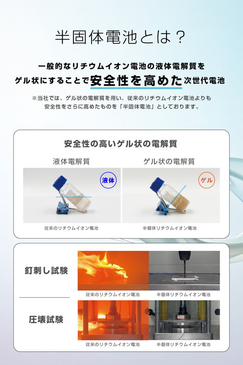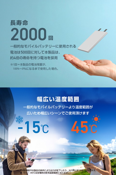 半固体リチウムイオン電池を採用した次世代モバイルバッテリーです。猛暑や極寒の環境でも使用でき、発火しにくい高い安全性と約2000サイクルの長寿命、優れた携帯性を実現。どこへでも持ち運べて、安心して使えます。さらに、バッテリー残量はLEDパネルに1%刻みで表示されるので、必要なタイミングで効率よく充電できます。