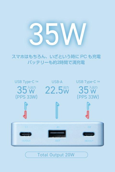 エレコム 半固体モバイルバッテリー 10000mAh 35W Type-C×2 USB-A モバイル バッテリー 半固体リチウム電池 残量表示 ブルー┃DE-C86-10000BU