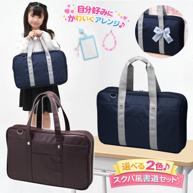 ◆スクールバッグ風のデザインがかわいい書道セットです。ネイビーは布地、チョコレートブラウンは合皮です。