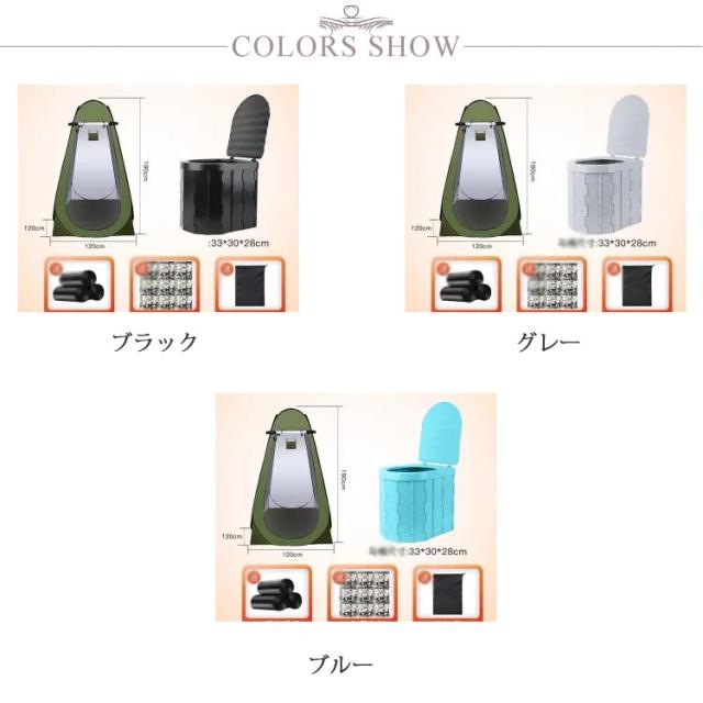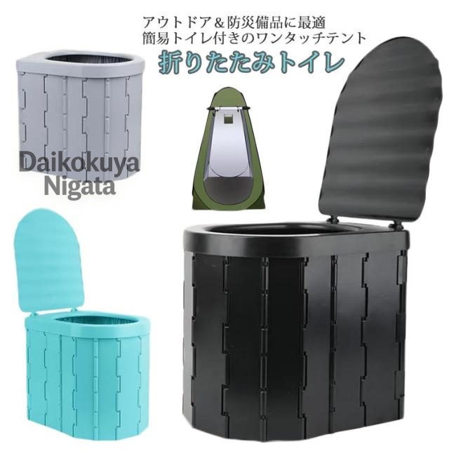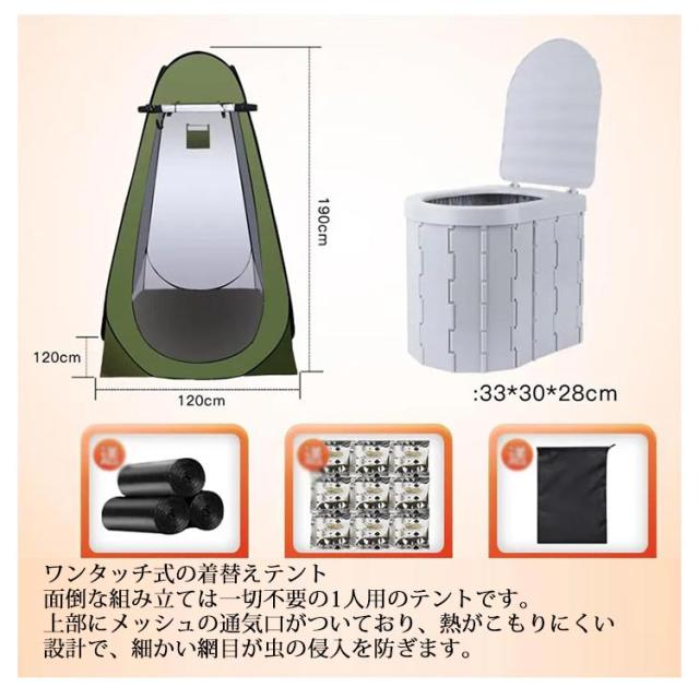 | アウトドア&防災備品に最適 簡易トイレ付きのワンタッチテント ワンタッチ式の着替えテント 面倒な組み立ては一切不要の1人用のテントです。 上部にメッシュの通気口がついており、熱がこもりにくい設計で、細かい網目が虫の侵入を防ぎます。 アウトドアや海水浴、コスプレイベントなど様々なシーンで活躍します。 ポータブルトイレ 便座一体型折りたたみ式ポータブルトイレです。 アウトドア、部屋や車の中、災害、断水の際に大活躍します。 人間工学に基づいて設計されているので小さなお子様からお年寄りの方まで安心してお使いいただけます。 介護用トイレ・屋外用トイレ・キャンプ・車用トイレ・登山・釣りなど幅広いシーンで活躍します。 軽量設計なので持ち運び、組立て楽々 力の弱い方、女性、小さなお子様でも簡単に組立てることができます。 また折りたたみ式で平らに収納できるため、収納場所に困りません。 | |