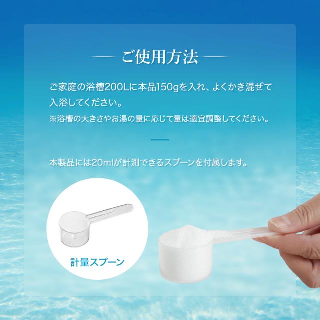 | 使用方法 | ご家庭の浴槽200Lに本品150gを入れ、よくかき混ぜて入浴してください。浴槽の大きさやお湯の量に応じて、量は適宜調整してください。 |