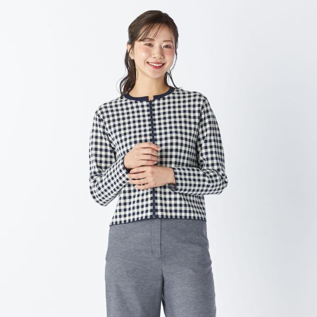 大人ガーリーな着こなしをかなえてくれるギンガムチェック柄のカーディガンです。ポリエステル×コットンの軽やかなニット素材で、インナーとしても着まわししやすくロングシーズンお使いいただけます。配色パイピングがアイテム全体にメリハリ感をプラス。カーディガンには珍しいファスナーもポイントです。