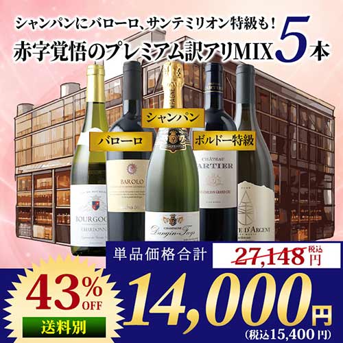 ワイン セット 「20」シャンパンにバローロ、サンテミリオン特級も!赤字覚悟のプレミアム訳アリMIX5本セット(赤ワイン2本・白ワイン2本・シャンパン1本)ワインセット【2セット買うと送料無料】【お試し ワインセット 家飲み ソムリエ 飲み比べ】