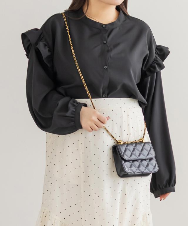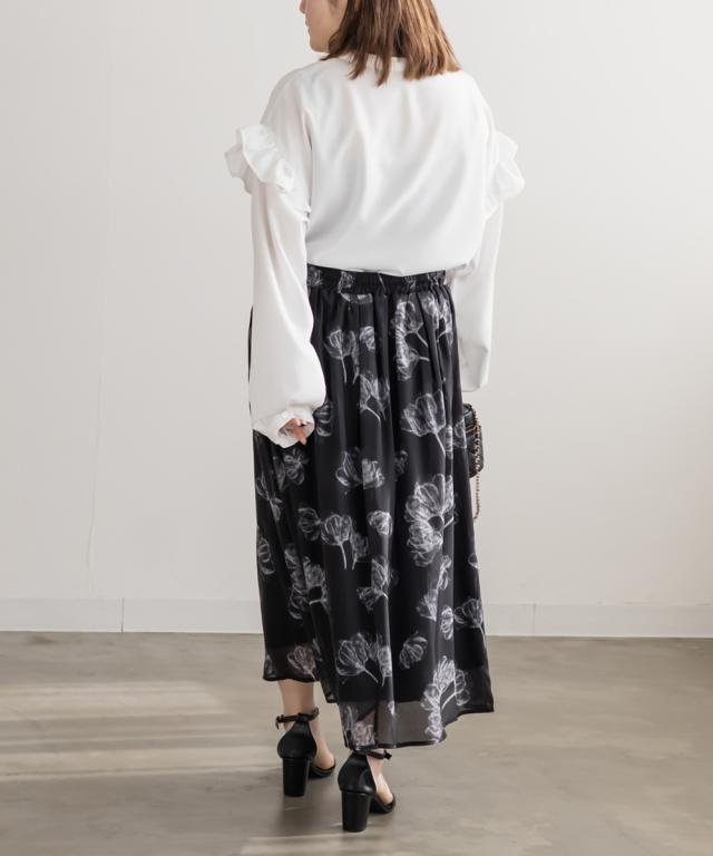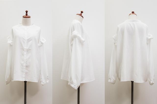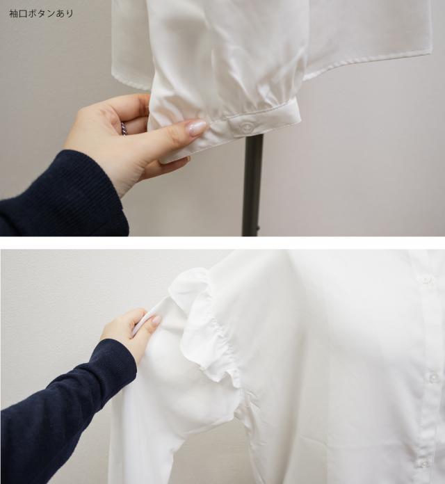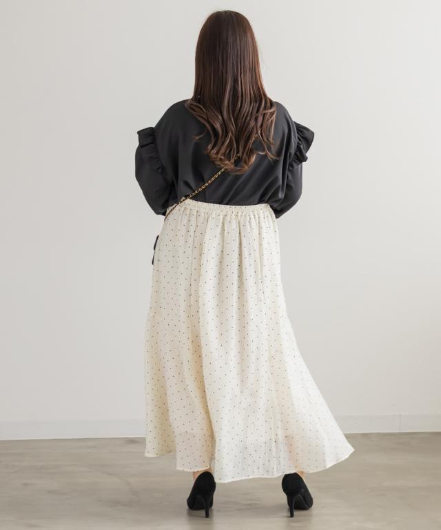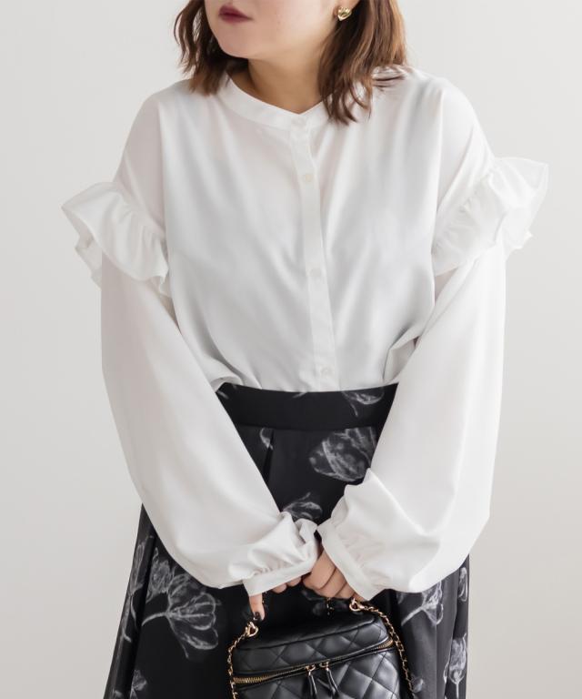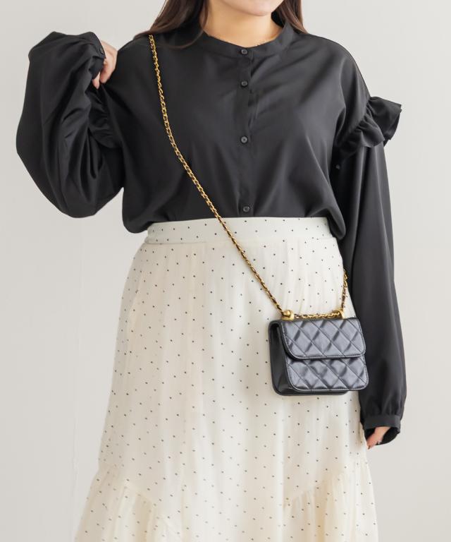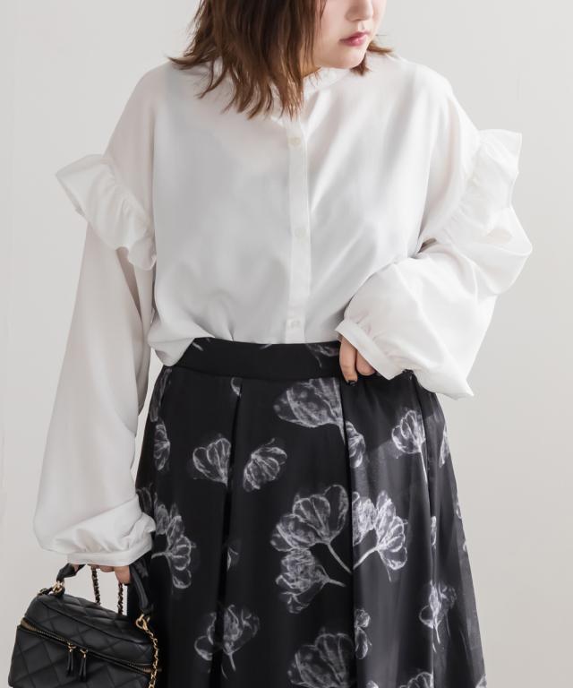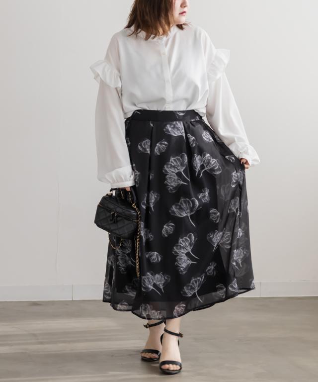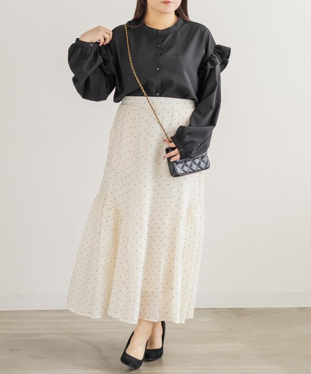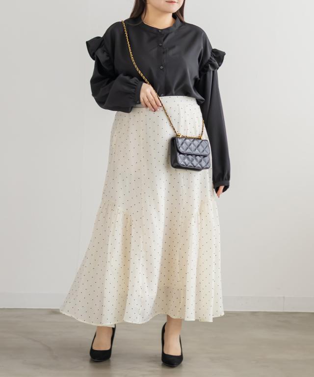 | 3Lサイズを着用しました。身幅や肩まわりに程よくゆとりがあり、全体的に楽な着心地でした。肩のフリルデザインが大きすぎないので着やすく、顔まわりを華やかに見せてくれて1枚で上品な印象に仕上がります。甘くなりすぎないデザインなので、大人っぽく着られるのも嬉しいポイントです! 身頃はすっきりとしたシルエットで、インでもアウトでもバランスよく着用できます。スカート合わせでフェミニンに、パンツ合わせで通勤スタイルにもおすすめの、着回し力の高いブラウスだと思いました◎ |