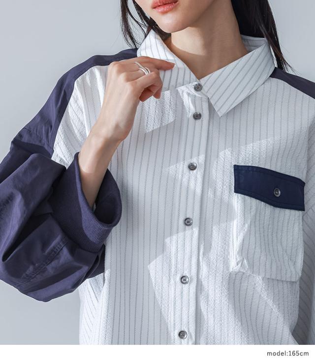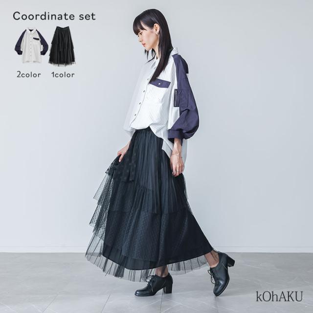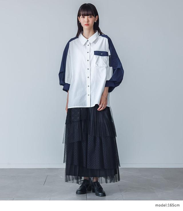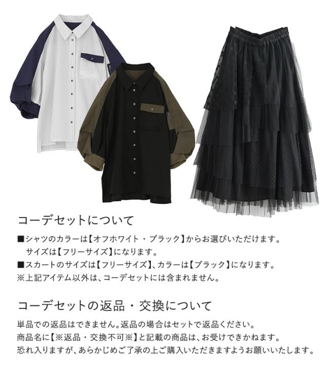 1,000円オフ4日0時迄 『異素材袖デザインシャツ×ドットチュールプリーツスカートコーデ2点SET』【メール便不可】【40】[2点コーデセット 2026 レディース シャツ 七分袖 トップス 異素材 襟付き スカート ロング丈 ボトムス チュールスカート ドット柄]
