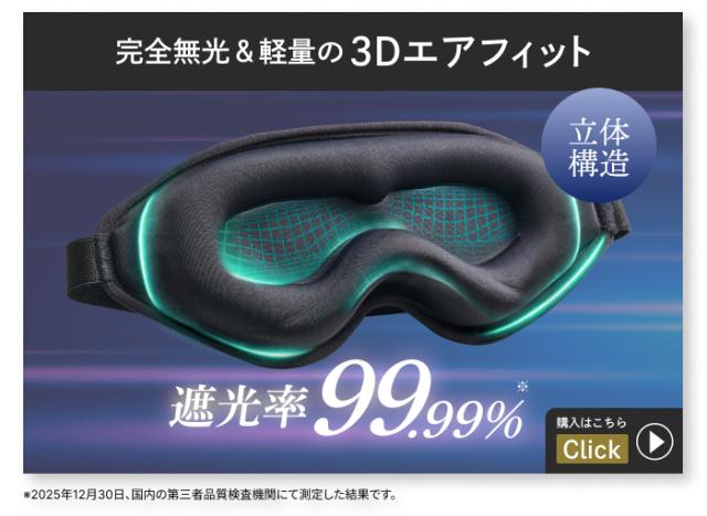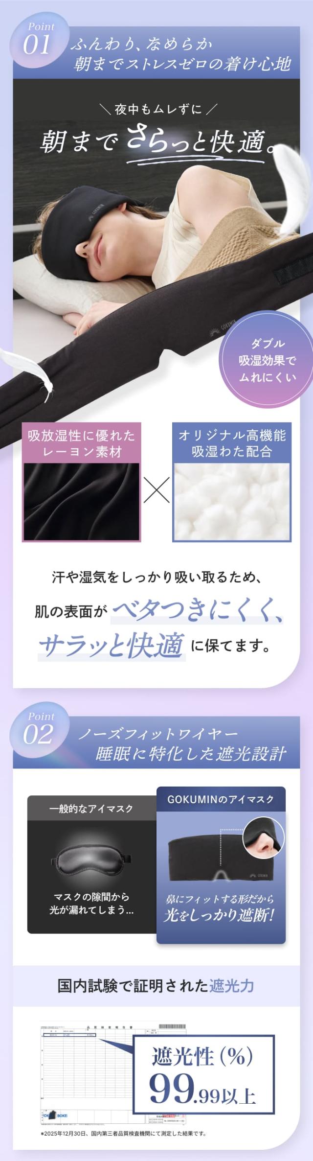 睡眠中の不快感の原因となるムレを防ぐため、通気性と吸放湿性に優れた素材を採用。汗や湿気をしっかり吸収しながら外へ逃がすことで、肌表面をさらっと快適な状態に保ちます。夜中にムレて外したくなるストレスを軽減し、朝まで心地よさが持続。季節を問わず使いやすく、長時間着用しても快適さを損なわないアイマスクです。