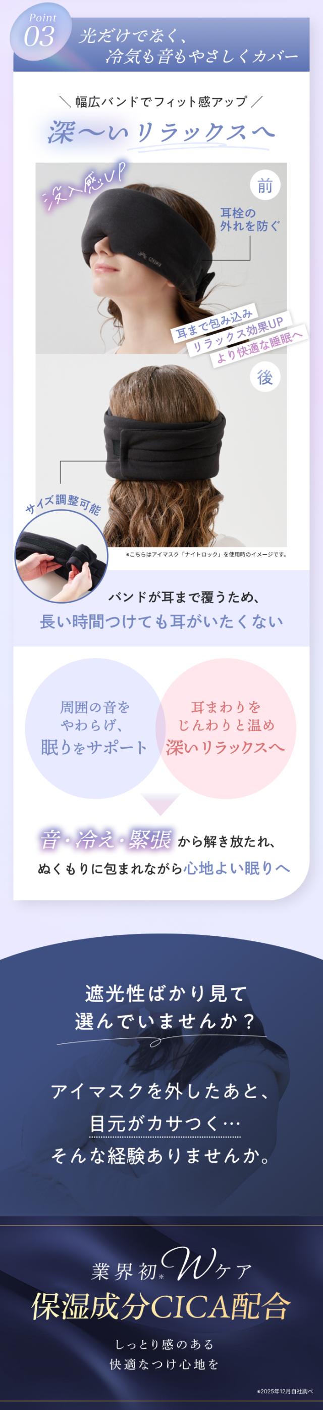 幅広のふんわりカバーが耳まで包み込み、顔全体に安心感をもたらします。大きめサイズで圧迫感を抑えながらフィットするため、長時間つけても違和感が出にくい設計です。サイズ調整が可能なので、自分に合った着け心地に調整できるのも魅力。包まれるような感覚がリラックスを促し、自然と深い休息へ導きます。