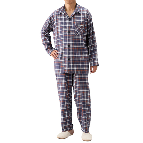 柔らかな綿100%素材を使用した、チェック柄の紳士用パジャマセット。