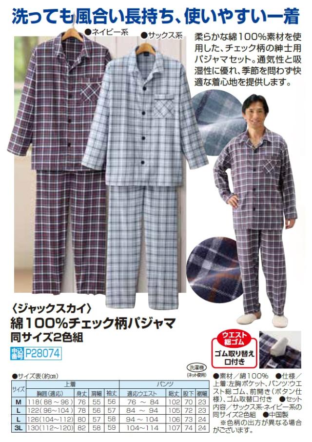 ジャックスカイ 綿100% チェック柄パジャマ 2色組 パジャマ 長袖 長ズボン コットン メンズ 紳士服 シニア 男性 大人 ネイビー ブルー シンプル 胸ポケット有り 通年 オールシーズン 40代 50代 60代 70代 80代 90代 父の日 お父さん 春夏 秋冬 sai p28074