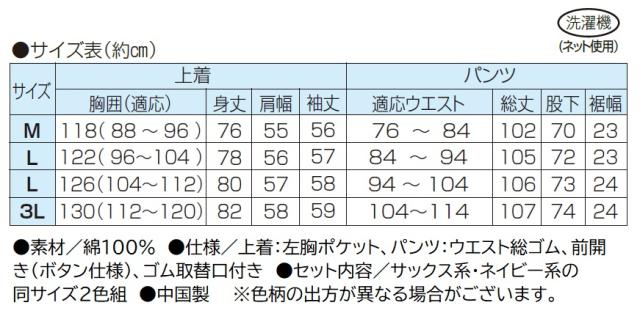 ●仕様/上着:左胸ポケット、パンツ:ウエスト総ゴム、前開き(ボタン仕様)、ゴム取替口付き
