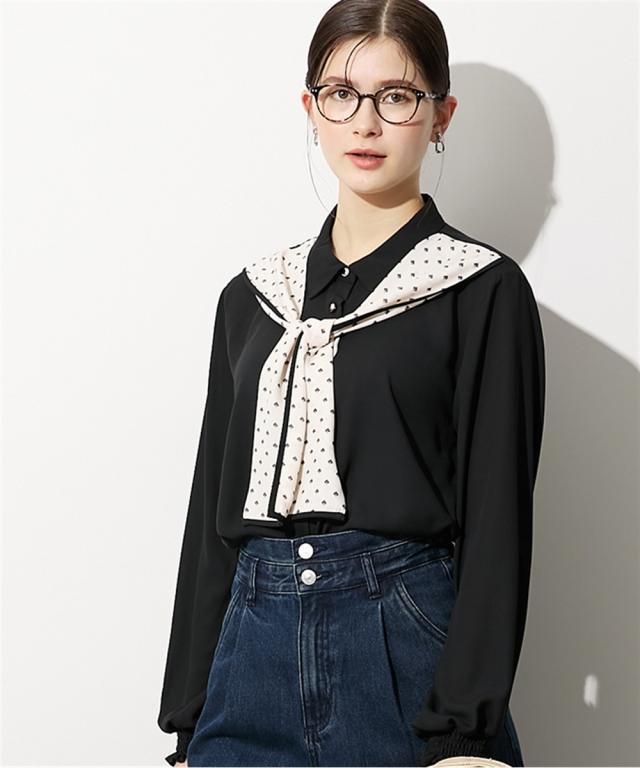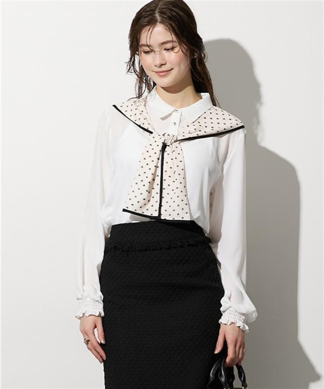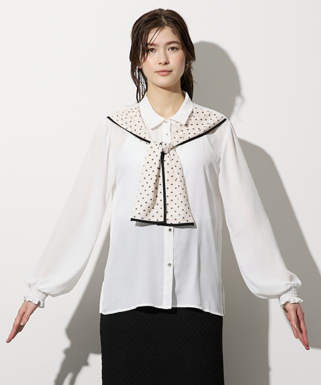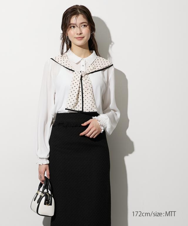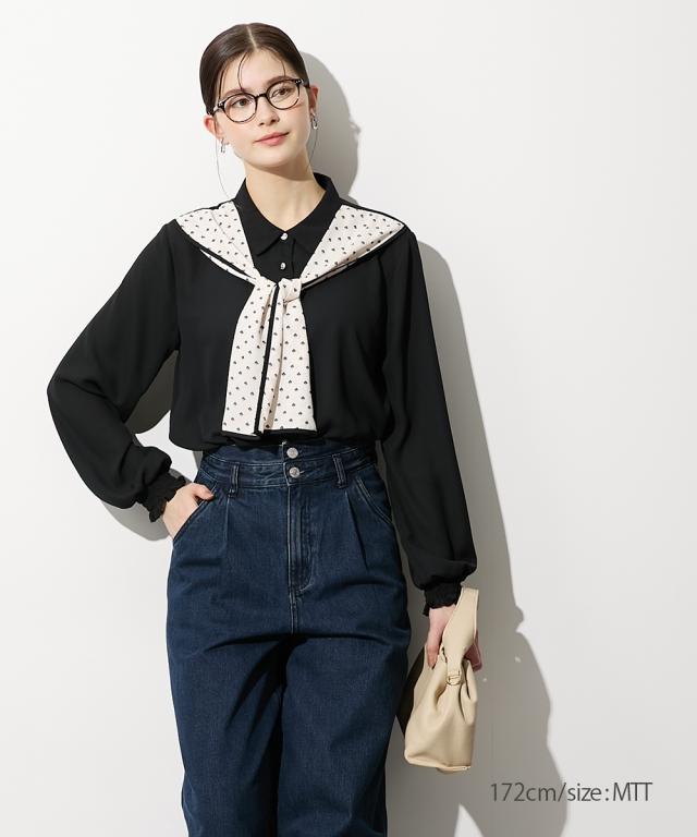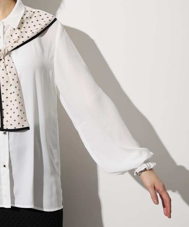 【高身長な方向け】結ぶだけでこなれる、幾何学柄ボウタイ風ブラウス ■デザイン 襟元に幾何学柄のスカーフをドッキングさせた、1枚でサマになる主役級ブラウスです。「巻く・結ぶ」だけで完成: スカーフを襟に通したような一体型デザインなので、形が崩れにくく、誰でも簡単に美しいタイシルエットが作れます。こだわりのディテール: スカーフの縁に施されたパイピングが全体を引き締め、顔周りをシャープな印象に。手元にニュアンスを: 袖口はシャーリング仕様。腕まくりがしやすく、ぽわんとしたボリューム袖のシルエットも楽しめます。 ■素材 品のあるジョーゼット生地: 控えめな光沢と柔らかな落ち感があり、シワになりにくいのが嬉しいポイント。軽やかな透け感: 重たく見えがちなブラックや、清潔感のあるホワイト。どちらも軽やかな素材感で、ロングシーズン着用可能です。 ■おすすめのスタイリング ドラマチックなハンサムスタイル: センタープレスのワイドパンツにイン。スカーフの柄をアクセントに、クールで都会的なオフィススタイルが完成します。レディなモノトーンコーデ: タイトなロングスカートと合わせて。スカーフをあえてラフに結ぶことで、カチッとしすぎない大人の余裕