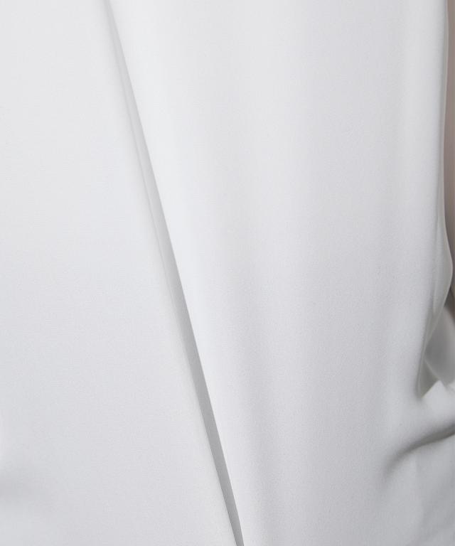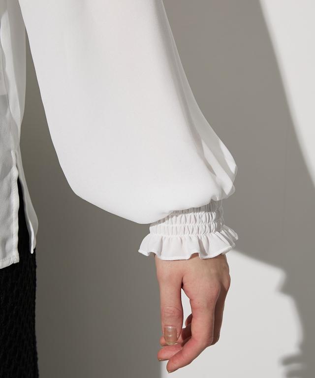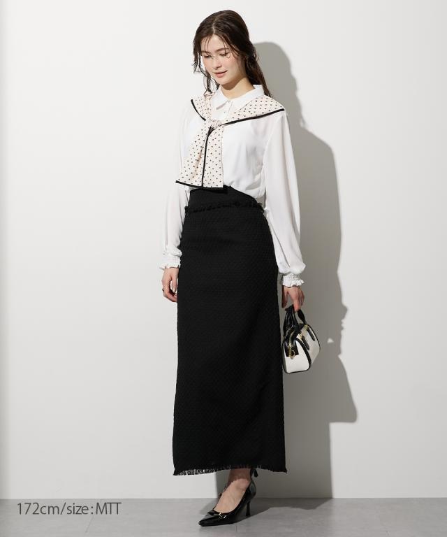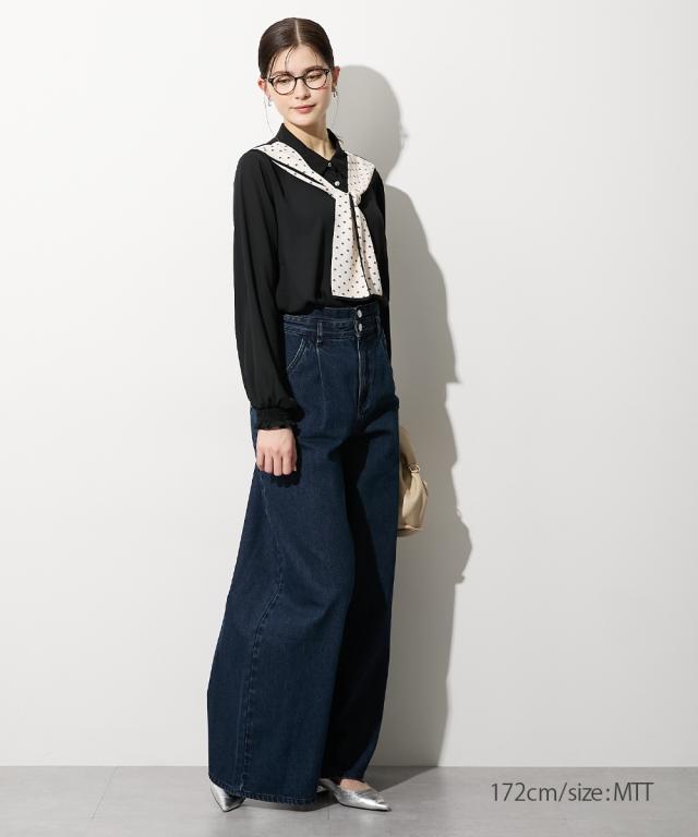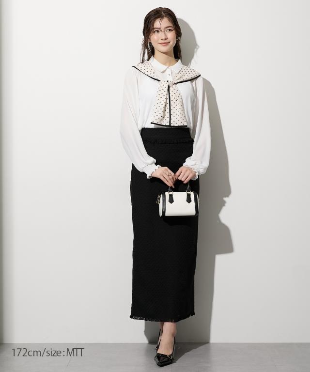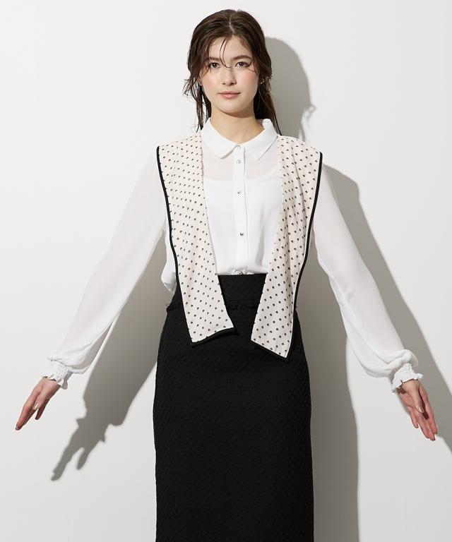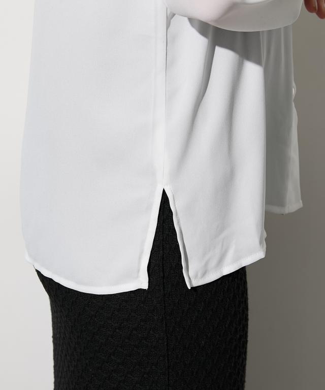 【高身長な方向け】結ぶだけでこなれる、幾何学柄ボウタイ風ブラウス ■デザイン 襟元に幾何学柄のスカーフをドッキングさせた、1枚でサマになる主役級ブラウスです。「巻く・結ぶ」だけで完成: スカーフを襟に通したような一体型デザインなので、形が崩れにくく、誰でも簡単に美しいタイシルエットが作れます。こだわりのディテール: スカーフの縁に施されたパイピングが全体を引き締め、顔周りをシャープな印象に。手元にニュアンスを: 袖口はシャーリング仕様。腕まくりがしやすく、ぽわんとしたボリューム袖のシルエットも楽しめます。 ■素材 品のあるジョーゼット生地: 控えめな光沢と柔らかな落ち感があり、シワになりにくいのが嬉しいポイント。軽やかな透け感: 重たく見えがちなブラックや、清潔感のあるホワイト。どちらも軽やかな素材感で、ロングシーズン着用可能です。 ■おすすめのスタイリング ドラマチックなハンサムスタイル: センタープレスのワイドパンツにイン。スカーフの柄をアクセントに、クールで都会的なオフィススタイルが完成します。レディなモノトーンコーデ: タイトなロングスカートと合わせて。スカーフをあえてラフに結ぶことで、カチッとしすぎない大人の余裕