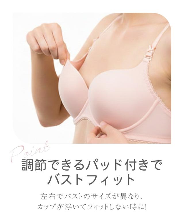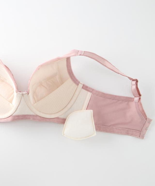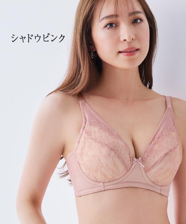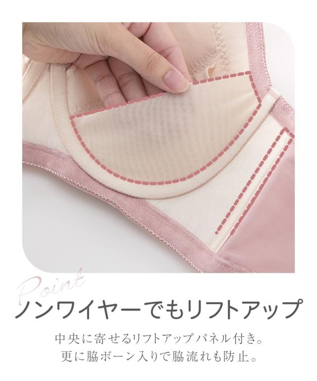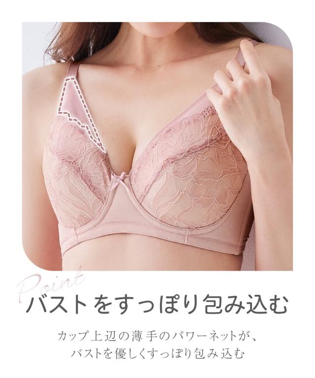 重力に打ち勝つノンワイヤーフルカップブラジャー お悩みポイント ・バストが重くて下垂し支えられない、持ち上げられない ・楽に着用したいけど、ノンワイヤーだとバストが横に流れて太ってみえる ・バストが左右で大きさが異なるので、いつもどちらかの胸が合わない こだわりポイント ・カップ台に厚みのある不織布を使用、更に下カップには短いボーンを内蔵し、バストを下から支えて持ち上げる ・ワイヤーがなくてもバストが中心によるリフトアップを内蔵し、更に脇ボーンで脇肉流れ防止する ・バスト中心を低く、カップ裏は3枚接ぎで、丸くて自然なバストシルエットでスッキリ ・カップ上辺の薄手のパワーネットがバストを優しくすっぽり包み込む ・バストが左右で大きさが異なるのでいつもどちらかの胸が合わない、取り外しできるパッドをつけました ・綺麗な大花レースのフルカップブラ ・バック部分は生地2重でしっかりサポート ・バックホックは3段3列でしっかり安定
