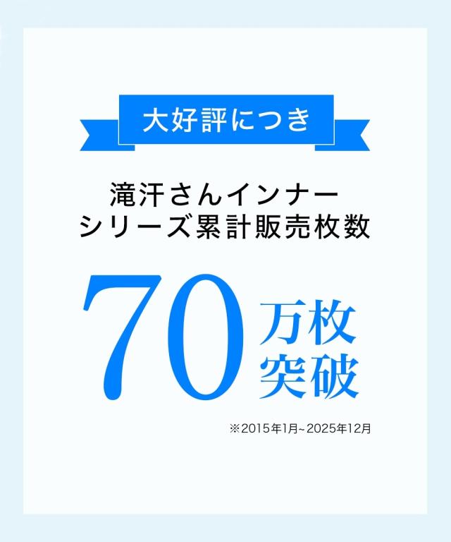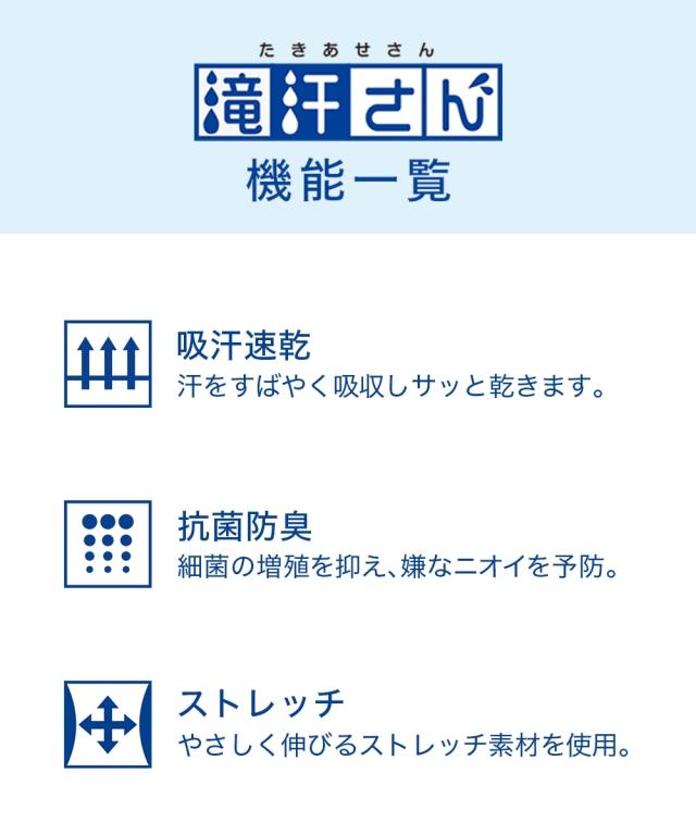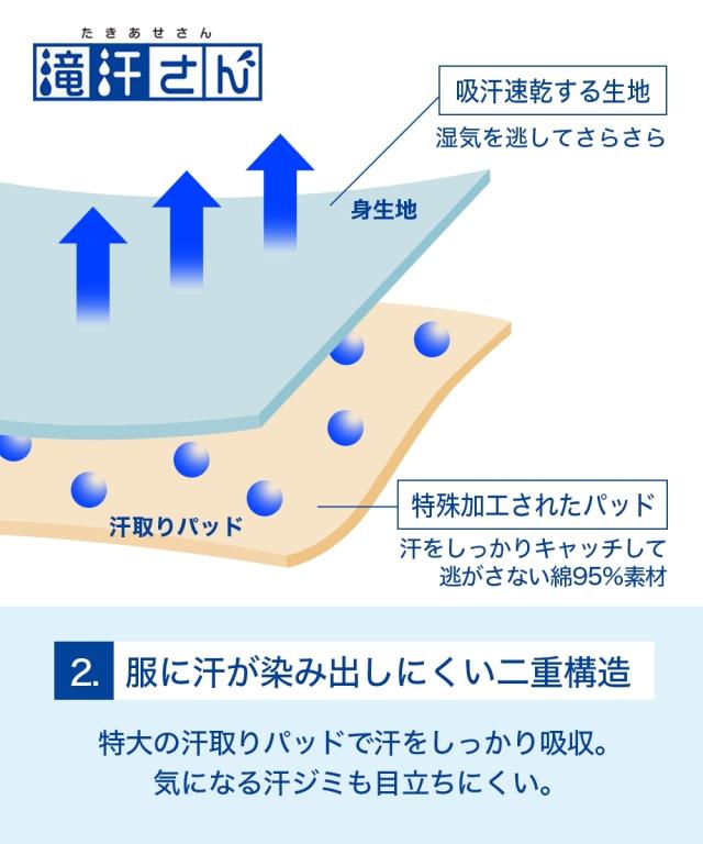 もう汗を気にしたくない方に向けた汗取りパッド付インナー ・汗を気にして長時間座っていられない・・・ ・立ち上がる時に不安がある ・ムレによる不快なニオイが心配 そんな滝汗の悩みに終止符を! 【滝汗さん】は汗を気にせず過ごしたい。 そんな汗かきさんに安心の機能が詰まったインナーです。「滝汗さん」脇全体を覆うように設計された特大汗取りパットで汗を逃さずキャッチ!汗を逃さないその秘密は、特殊な加工をを施した二重構造の汗取りパッド。肌にあたる部分は汗をさっと吸う綿混素材を、その裏に撥水加工をすることで汗が染み出すのを防ぎます。身生地は薄手の吸汗速乾素材。汗をかいても素早く吸収しサッと乾くので快適。なめらかな肌触りとストレッチ性のある生地で気持ちよくストレスのない着心地。抗菌防臭加工でイヤなニオイを防ぎます。汗染みを気にしない1日を「滝汗さん」で!
