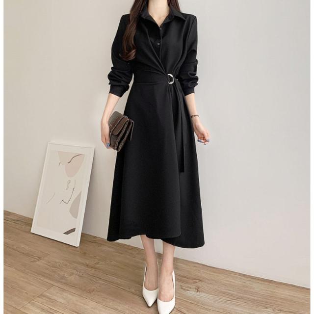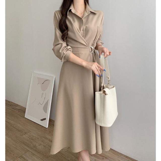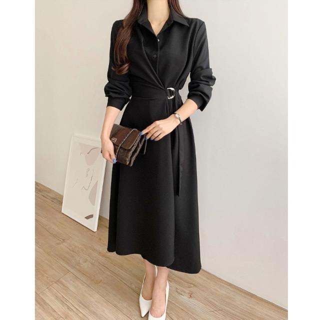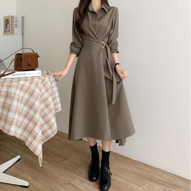 ワンピース フレアワンピース 長袖 シャツワンピ Aライン ロング レディース 韓国ファッション きれいめ オフィス 通勤 上品 ウエストマーク
